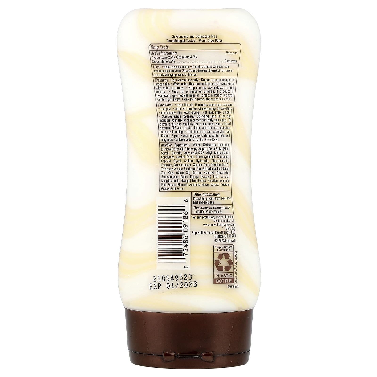 | Вспомогательные ингредиенты: Вода, масло семян сафлора (Carthamus tinctorius), диизопропил адипат, рисовый крахмал (Oryza sativa), глицерин, акрилат/c12-22 алкил метакрилат сополимер, спирт денатурированный, феноксиэтанол, карбомер, каприлилгликоль, гидроксид натрия, хлорфенезин, отдушка, глюконолактон , ксантановая камедь, двунатриевая ЭДТК, токоферилацетат, пантенол, сок листьев алоэ вера (Aloe barbadensis), кукурузное масло, аскорбил фосфат натрия, бета-каротин, экстракт плодов папайи (Carica papaya), экстракт плодов манго (Mangifera indica), пассифлора (Passiflora incarnata) экстракт плодов, экстракт цветков плюмерии (Plumeria acutifolia), экстракт плодов гуавы (Psidium guajava). | |