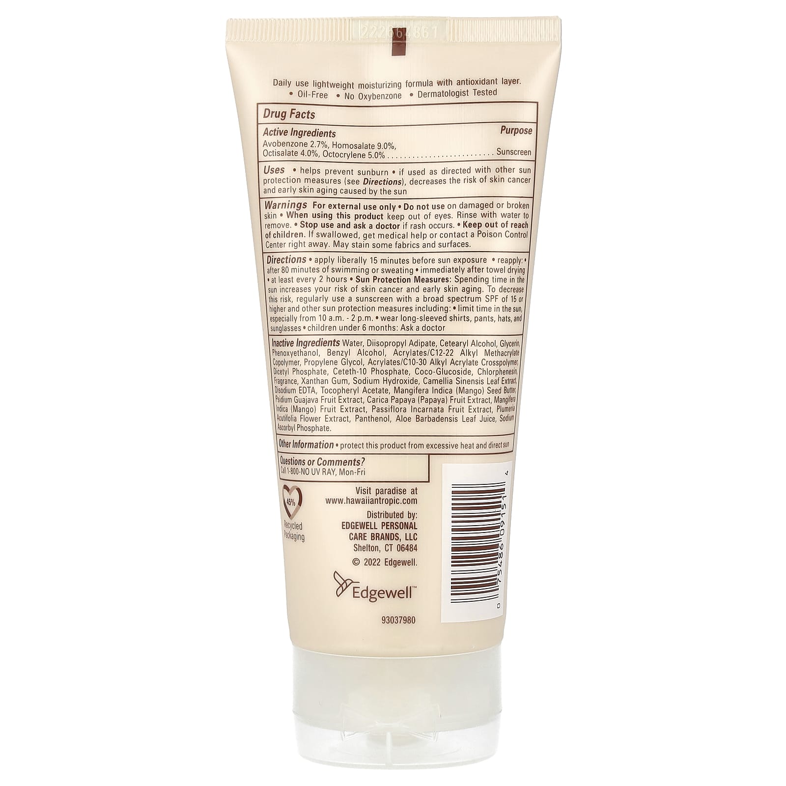 | Вспомогательные ингредиенты: Вода, c12-15-алкилбензоат, бутилоктилсалицилат, цетеариловый спирт, диизопропиладипат, фенетилбензоат, полиметилметакрилат, полиметилсилсесквиоксан, феноксиэтанол, каприлилгликоль, сополимер эйкозена, бензиловый спирт / c12-2-диметилакрилат , пропиленгликоль, кроссполимер акрилатов / c10-30 алкилакрилата, отдушка, кокоглюкозид, хлорфенезин, цетет-10 фосфат, дицетилфосфат, гидроксид натрия, экстракт листьев камелии китайской, динатрий ЭДТ, парафин, ксантановая камедь, аскорбилфосфат натрия ацетат, сок листьев алоэ барбаденсис, экстракт плодов папайи (Carica papaya), экстракт плодов манго (Mangifera indica), экстракт плодов пассифлоры (Passiflora incarnata), экстракт цветков плюмерии остролистной, экстракт плодов псидиума гуахавы. | |