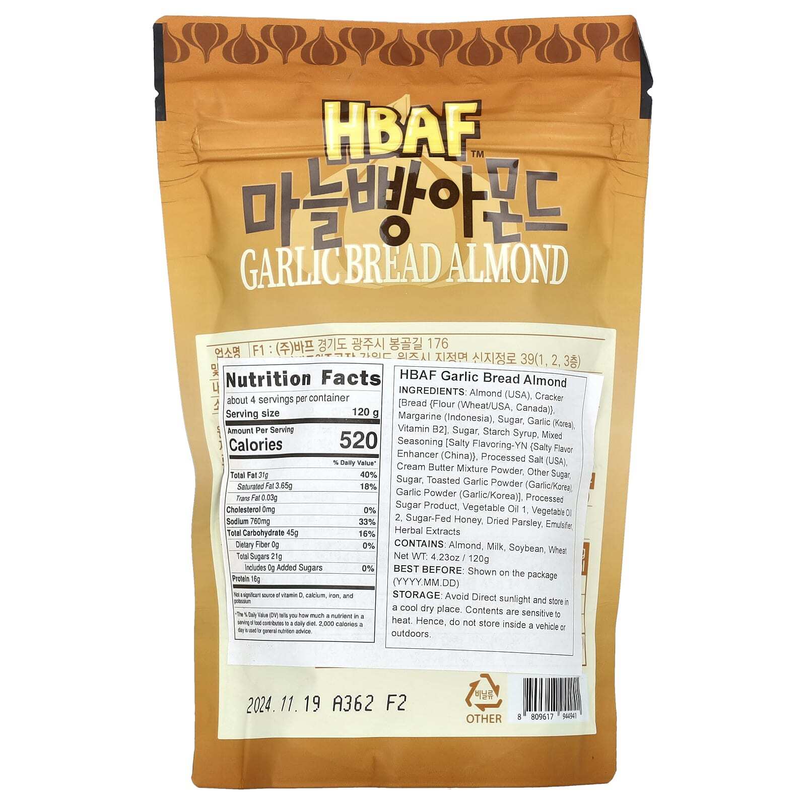 Миндаль (сша), крекер [хлеб {мука (пшеница / США, canada)}, маргарин (Индонезия), сахар, чеснок (корея), витамин B2], сахар, крахмальный сироп, смешанные приправы [соленый ароматизатор {усилитель соленого вкуса (китай)}, обработанная соль (США), порошок сливочно-масляной смеси, другой сахар, сахар, обжаренный чесночный порошок (чеснок / корея), чесночный порошок (чеснок / корея)], обработанный сахарный продукт, растительное масло 1, растительное масло 2, мед сахарного откорма, сушеная петрушка, эмульгатор, экстракты трав.