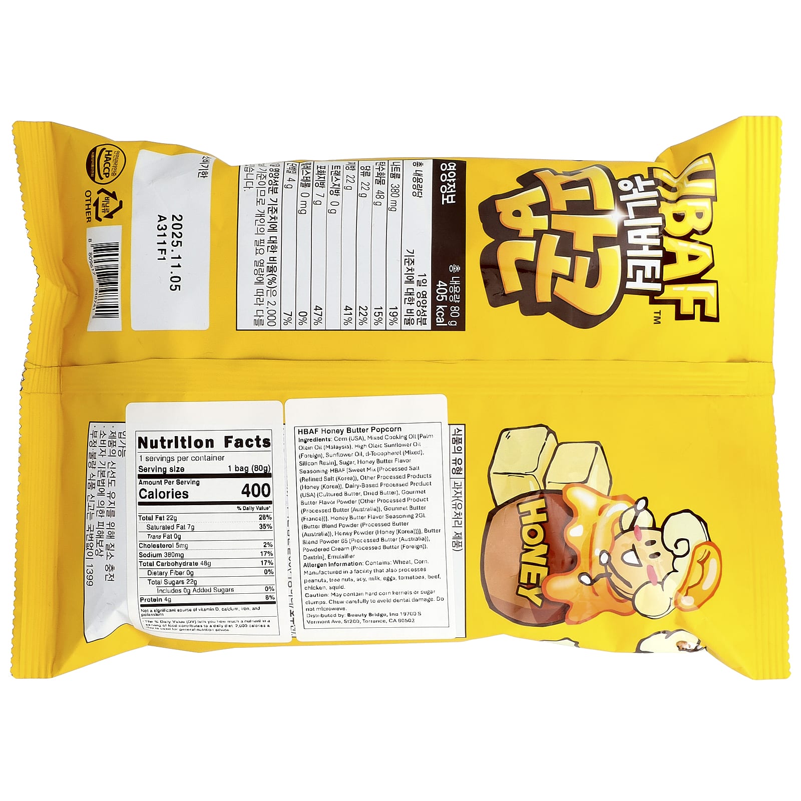 Кукурузы (сша), смешанное кулинарное масло [пальмовое олеиновое масло (Малайзия), высокоолеиновое подсолнечное масло (импортное), подсолнечное масло, d-токоферол (смешанный), силиконовая смола], сахар, приправа со вкусом меда и масла-хбаф [сладкая смесь {обработанная соль (рафинированная соль (Корея)), прочие продукты переработки (мед (Корея)), обработанный продукт на молочной основе (США) (кисломолочное масло, сушеное масло), порошок со вкусом сливочного масла для гурманов (другой продукт переработки (обработанное масло (австралия)), масло для гурманов (Франция)), приправы со вкусом меда и сливочного масла 2 мл (порошок из масляной смеси (обработанное масло (австралия)), медовая пудра (мед (корея)))}, смесь сливочных масел в порошке 65 (обработанное масло (австралия)), сливки в порошке (масло сливочное (иностранное)), декстрин], эмульгатор.