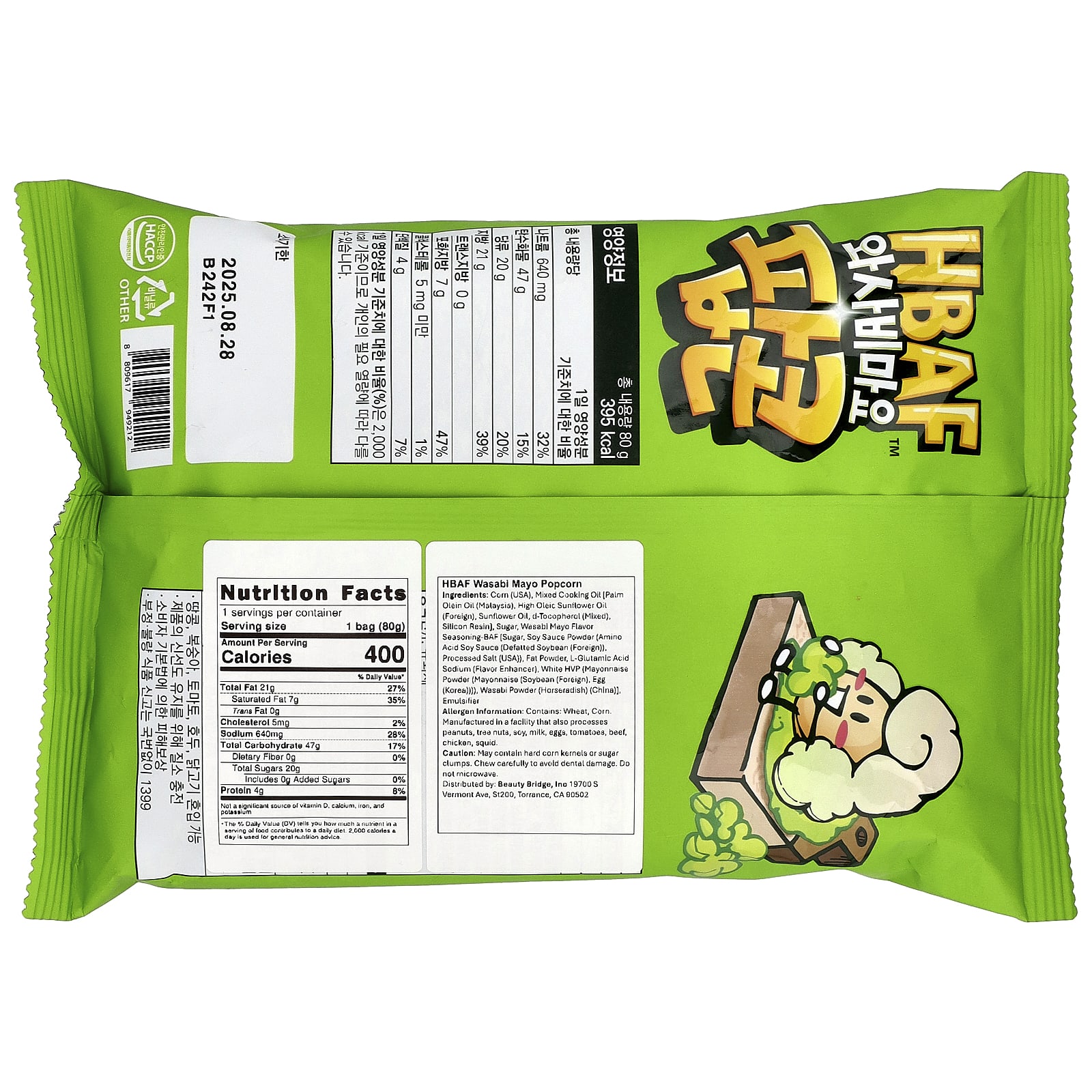 Кукуруза (США), смешанное кулинарное масло [пальмовое олеиновое масло (Малайзия), высокоолеиновое подсолнечное масло (импортное), подсолнечное масло, d-токоферол (смешанный), силиконовая смола], сахар, приправа-баф со вкусом васаби и майонеза [сахар, порошок соевого соуса (аминокислоты соевого соуса (обезжиренные соевые бобы (импортные)), обработанная соль (США)), жирная пудра, l-глутаминовая кислота натрия (усилитель вкуса), белый HVP (порошок из майонеза (майонез (соя (импортный)), яйцо (Корея)), порошок васаби (хрен) (Китай)], эмульгатор.