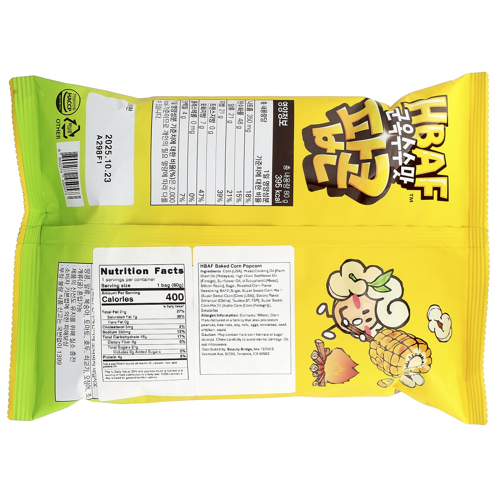 Кукуруза (США), смешанное кулинарное масло [пальмовое олеиновое масло (Малайзия), высокоолеиновое подсолнечное масло (импортное), подсолнечное масло, d-токоферол (смешанный), силиконовая смола], сахар, приправа со вкусом обжаренной кукурузы-баф 2 [сахар, смесь супер сладкой кукурузы 1 {супер сладкая кукуруза (кукуруза (США)), усилитель пикантного вкуса (Китай), таурин, fsp}, смесь супер сладкой кукурузы 21 [альфа-кукуруза (кукуруза (импортная)], эмульгатор.