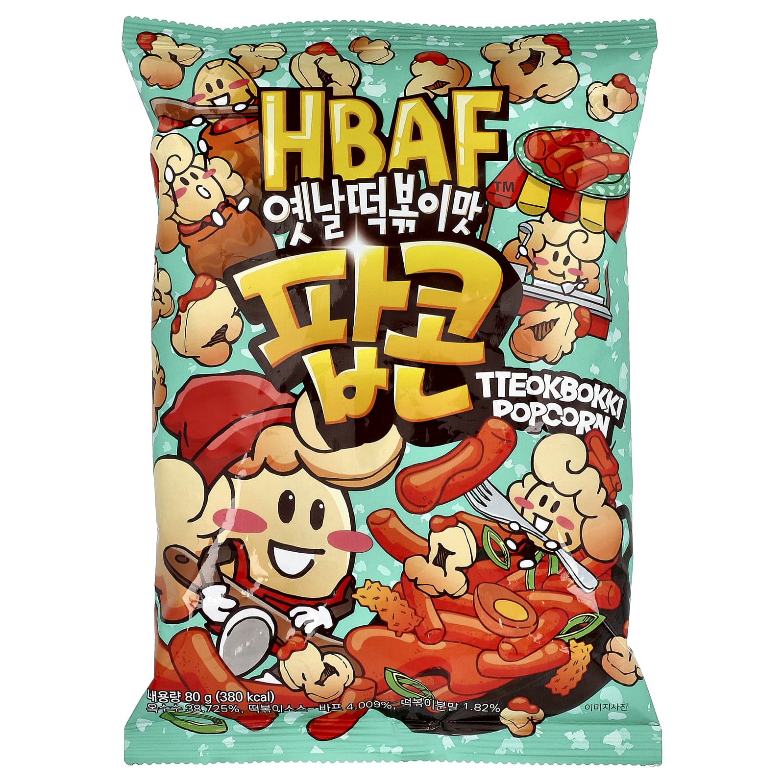 Кукуруза (США), сахар, смешанные растительные масла [пальмовое олеиновое масло (Малайзия), высокоолеиновое подсолнечное масло (импортное), подсолнечное масло, d-альфа-токоферол (витамин E, антиоксидант), диоксид кремния (если применимо)], составная приправа [порошок ттеокбокки (импортный), сахар, усилитель пикантного вкуса (импортный), обработанная соль, луковый порошок], крахмальный сироп, соус ттеокбокки · баф, растительное масло (указать вид), растительное масло (указать вид), эмульгатор, травяной экстракт.