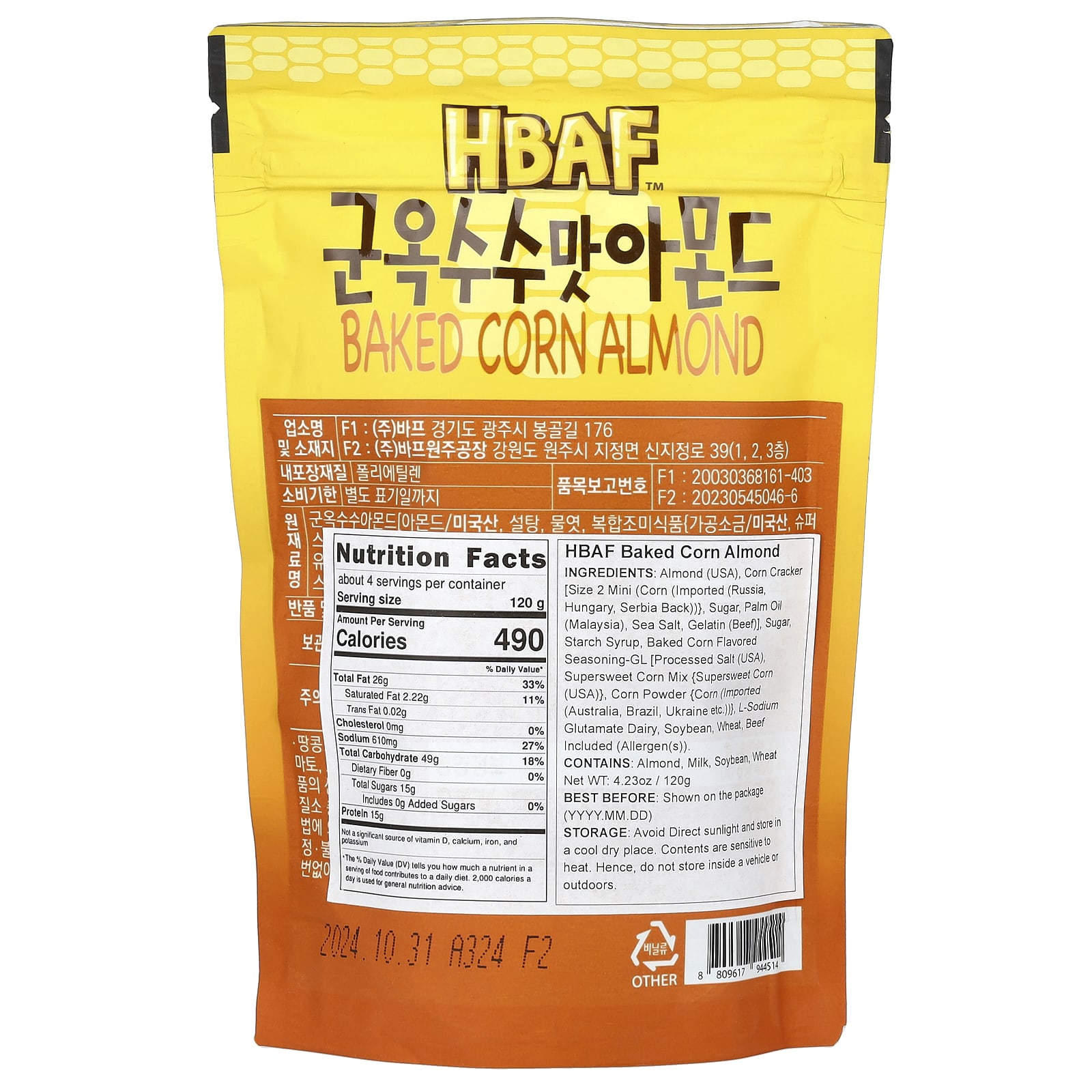 Миндаль (сша), кукурузный крекер, [размер 2 мини (кукуруза (импортная, Венгрия, Сербия назад)], сахар, пальмовое масло (малайзия), морская соль, желатин (говядина)], сахар, крахмальный сироп, приправа со вкусом печеной кукурузы [обработанная соль (США), смесь суперсладкой кукурузы {supersweet кукуруза (США)}, кукурузный порошок {кукуруза (импортная (Австралия, Бразилия, украина и др.)}, l-глутамат натрия, соя, пшеница, говядина (аллерген (ы)).