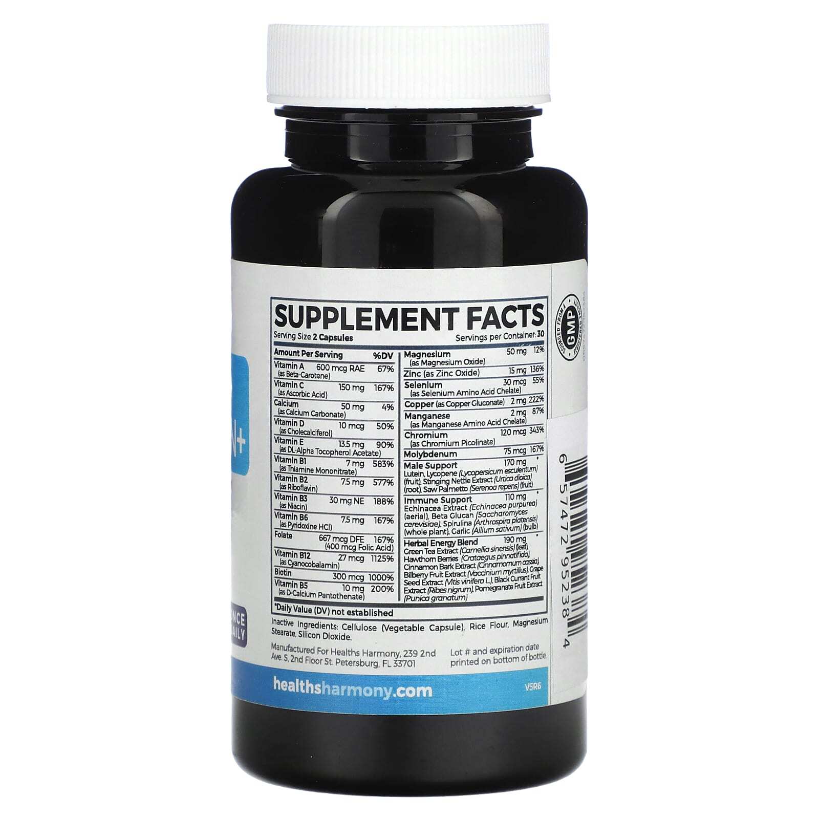 Мультивитамины для мужчин от Healths Harmony! Поддерживайте здоровье простаты, укрепляйте иммунитет, улучшайте зрение, повышайте уровень энергии, укрепляйте тело и разум с помощью множества витаминов и минералов - всего по две растительные капсулы в день!