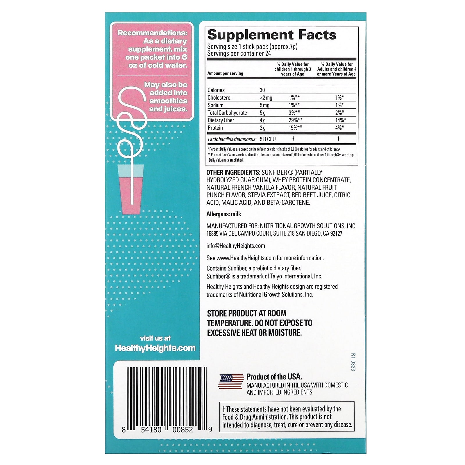 Sunfiber® (частично гидролизованная гуаровая камедь), концентрат сывороточного протеина, натуральный ароматизатор «Французская ваниль», натуральный ароматизатор фруктовый пунш, экстракт стевии, сок красной свеклы, лимонная кислота, яблочная кислота, бета-каротин.