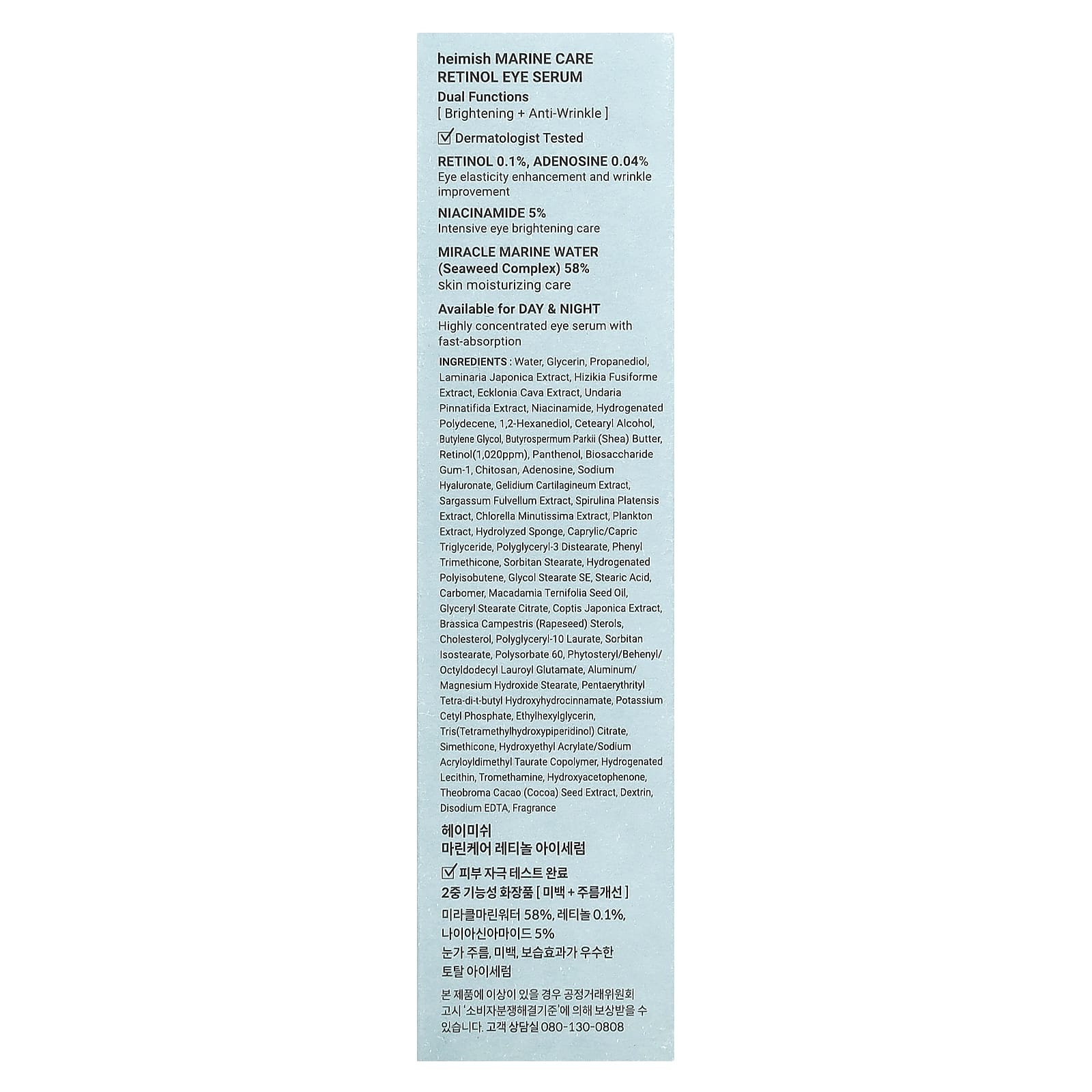 Вода, глицерин, пропандиол, экстракт ламинарии японской (Laminaria japonica), экстракт хизикии (Hizikia fusiforme), эклонии полой (Ecklonia cava), экстракт ундарии перистой (Undaria pinnatifida), ниацинамид, гидрогенизированный полидецен, 1,2-гександиол, цетеариловый спирт, бутиленгликоль, масло ши (Butyrospermum parkii), ретинол (1020 част. / млн), пантенол, биосахаридная камедь-1, хитозан, аденозин, гиалуронат натрия, экстракт агарофита (Gelidium cartilagineum), экстракт саргасса фулвеллум (Sargassum fulvellum), экстракт спирулины (Spirulina platensis), экстракт хлореллы (Minutissima), экстракт планктона, гидролизованная губка, каприловый/каприновый триглицерид, полиглицерил-3 дистеарат, фенилтриметикон, сорбитан стеарат, гидрогенизированный полиизобутен, гликоль стеарат, стеариновая кислота, карбомер, масло из семян макадамии (Macadamia ternifolia), глицерил стеарат цитрат, экстракт сверции японской (Swertia japonica), рапсовые стеролы (Brassica campestris), холестерин, полиглицерил-10 лаурат, сорбитан изостеарат, полисорбат 60, фитостерил / бегенил / октилдодецил лауроил глутамат, гидроксид алюминия / стеарат, пентаэритритил тетра-ди-трет-бутил гидроксигидроциннамат, цетилфосфат калия, этилгексилглицерин, трис (тетраметилгидроксипиперидинол) цитрат, симетикон, гидроксиэтил акрилат/натрия акрилоилдиметилтаурата сополимер, гидрогенизированный лецитин, трометамин, гидроксиацетофенон, экстракт зерен какао (Theobroma cacao), декстрин, динатрий ЭДТ, отдушка.
