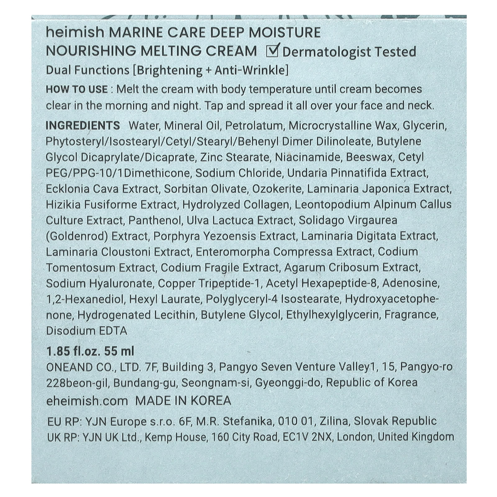 Вода, минерального масла, вазелин, микрокристаллический воск, глицерин, фитостерил/изостеарил/цетил/стеарил/бегенил димер дилинолеат, бутиленгликоль дикаприлат/дикапрат, стеарат цинка, никотинамид, пчелиный воск, цетил ПЭГ/ППГ-10/1 диметикон, хлорид натрия, экстракт ундарии перистой (Undaria pinnatifida), экстракт водоросли эклонии кавы (Ecklonia cava), сорбитан оливат, озокерит, экстракт ламинарии японской (Laminaria japonica), экстракт хидзики (Hizikia fusiforme), гидролизованный коллаген, экстракт каллусной культуры эдельвейса (Leontopodium alpinum), пантенол, экстракт ульвы латука (Ulva lactuca), экстракт золотарника (solidago virgaurea), экстракт порфиры (Porphyra yezoensis), экстракт ламинарии пальчаторассеченной (Laminaria digitata), экстракт ламинарии Клоустона (Laminaria cloustoni), экстракт энтероморфы компрессы (Enteromorpha compressa), экстракт кодиума (Codium tomentosum), экстракт кодиума (Codium fragile), экстракт агарума (agarum cribrosum), гиалуронат натрия, меди трипептид-1, ацетил гексапептид-8, аденозин, 1,2-гександиол, гексил лаурат, полиглицерил-4 изостеарат, гидроксиацетофенон, гидрогенизированный лецитин, бутиленгликоль, этилгексилглицерин, отдушка, двунатриевая ЭДТК.