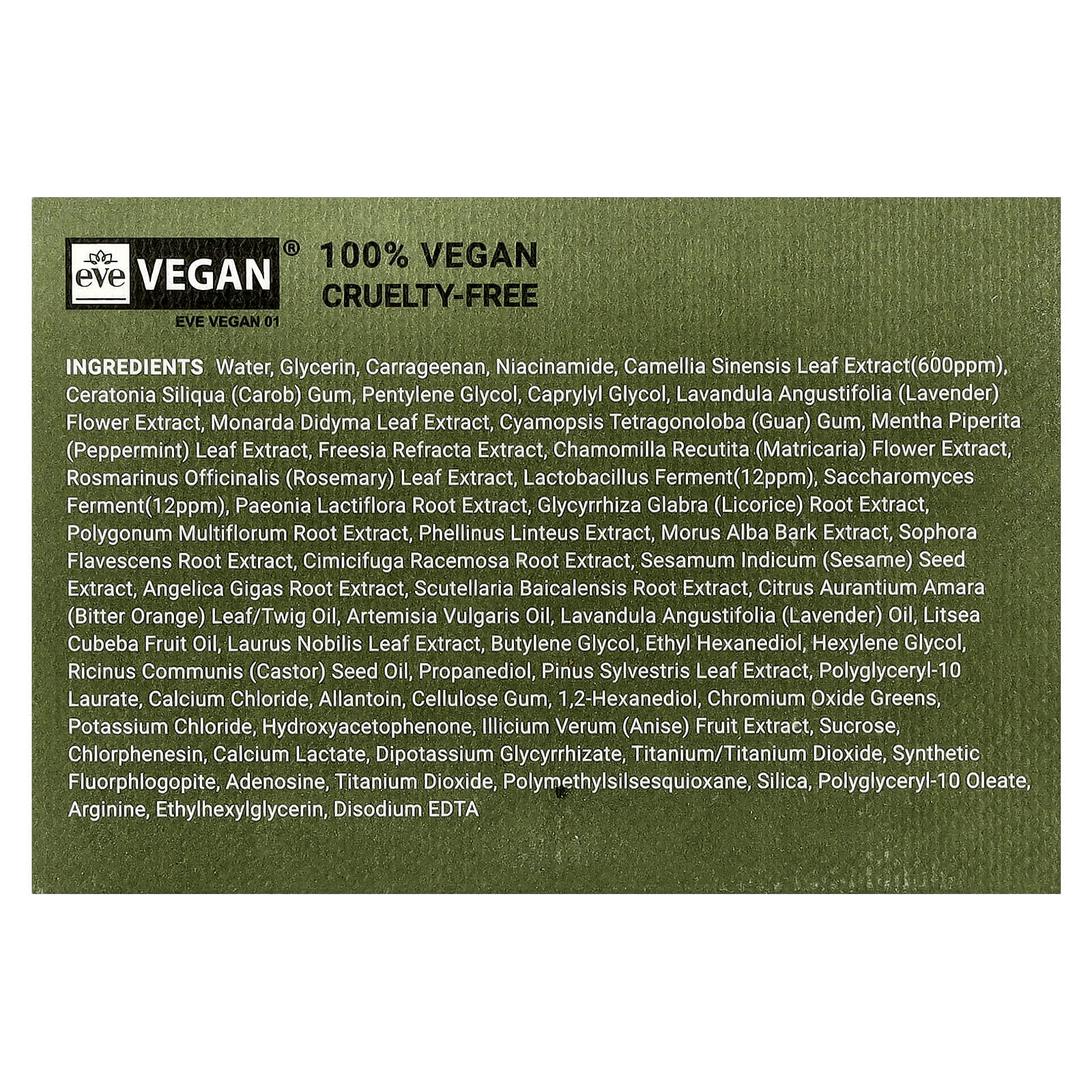 Вода, глицерин, каррагинан, никотинамид, экстракт листьев камелии китайской (600 част. / млн), камедь рожкового дерева (Ceratonia siliqua), пентилен гликоль, каприлилгликоль, экстракт цветков лаванды (Lavandula angustifolia), экстракт листьев монарды двойчатой (Monarda didyma), гуаровая камедь (Cyamopsis tetragonoloba), экстракт листьев перечной мяты (Mentha piperita), экстракт фрезии (Feesia refracta), экстракт цветков ромашки лекарственной (Chamomilla recutita), экстракт листьев розмарина (Rosmarinus officinalis), фермент лактобактерий (12 част. / млн), фермент сахаромицетов (12 част. / млн), экстракт корня пиона молочноцветкового (Paeonia lactiflora), экстракт корня солодки (Glycyrrhiza glabra), экстракт корня горца многоцветкового (Polygonum multiflorum), экстракт санхвана (Phellinus linteus), экстракт коры шелковицы белой (Morus alba), экстракт корня софоры желтоватой (Sophora flavescens), экстракт корня клопогона кистевидного (Cimicifuga racemosa), экстракт семян кунжута (Sesamum indicum), экстракт корня дудника гигантского (Angelica gigas), экстракт корня шлемника (Scutellaria baicalensis), масло из листьев / веток апельсина (Citrus aurantium amara), полыни (Artemisia vulgaris), лавандовое масло (Lavandula angustifolia), масло плодов лицеи кубебы (Litsea cubeba), экстракт листьев лаврака благородного, бутиленгликоль, этил гександиол, гексиленгликоль, касторовое масло (Ricinus communis), пропандиол, экстракт хвои сосны (Pinus sylvestris), полиглицерил-10 лаурат, хлорид кальция, аллантоин, целлюлозная камедь, 1,2-гександиол, хромовая зелень, хлорид калия, гидроксиацетофенон, экстракт плодов аниса звездчатого (Illicium verum), сахароза, хлорфенезин, лактат кальция, дикалия глицирризат, титан / диоксид титана, синтетический фторфлогопит, аденозин, диоксид титана, полиметилсилсесквиоксан, диоксид кремния, полиглицерил-10 олеат, аргинин, этилгексилглицерин, двунатриевая ЭДТК.