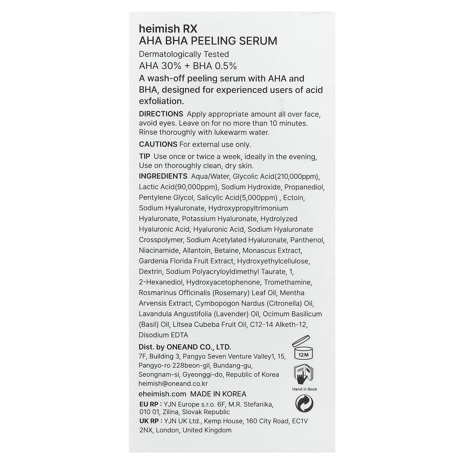 Вода, гликолиевая кислота (210 000 част./млн), молочная кислота (90 000 част./млн), гидроксид натрия, пропандиол, пентилен гликоль, салициловая кислота (5000 част./млн), эктоин, гиалуронат натрия, гиалуронат гидроксипропилтримония, гиалуронат калия, гидролизованная гиалуроновая кислота, гиалуроновая кислота, гиалуронат натрия кроссполимер, ацетилированный гиалуронат натрия, пантенол, никотинамид, аллантоин, бетаин, экстракт красного ферментированного риса (Monascus purpureus), экстракт плодов гардении жасминовидной (Gardenia florida), гидроксиэтилцеллюлоза, декстрин, полиакрилодиметил таурат натрия, 1,2-гександиол, гидроксиацетофенон, трометамин, масло из листьев розмарина (Rosmarinus officinalis), экстракт полевой мяты (Mentha arvensis), масло цитронеллы (Cymbopogon nardus), лавандовое масло (Lavandula angustifolia), базиликовое масло (Ocimum basilicum), масло плодов лицеи кубебы (Litsea cubeba), c12-14 алкет-12, двунатриевая ЭДТК.