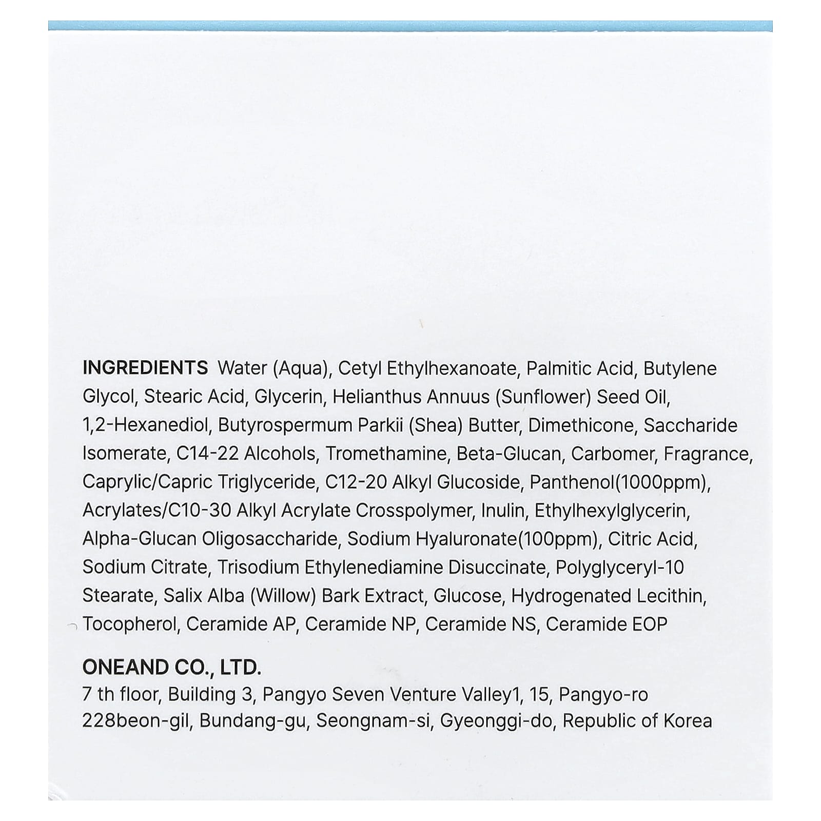 Вода, цетилэтилгексаноат, пальмитиновая кислота, бутиленгликоль, стеариновая кислота, глицерин, подсолнечное масло (Helianthus annuus), 1,2-гександиол, масло ши (Butyrospermum parkii), диметикон, инвертный сахар, c14-22 спирты, трометамин, бета-глюкан, карбомер, отдушка, каприловый/каприновый триглицерид, c12-20 алкил глюкозид, пантенол (1000 част./млн), акрилат/c10-30 алкил акрилат кроссполимер, инулин, этилгексилглицерин, альфа-глюкан олигосахарид, гиалуронат натрия (100 част./млн), лимонная кислота, цитрат натрия, тринатрия этилендиамин дисукцинат, полиглицерил-10 стеарат, экстракт коры ивы (Salix alba), глюкоза, гидрогенизированный лецитин, токоферол, керамид АP, керамид NP, керамид NS, керамид EOP.