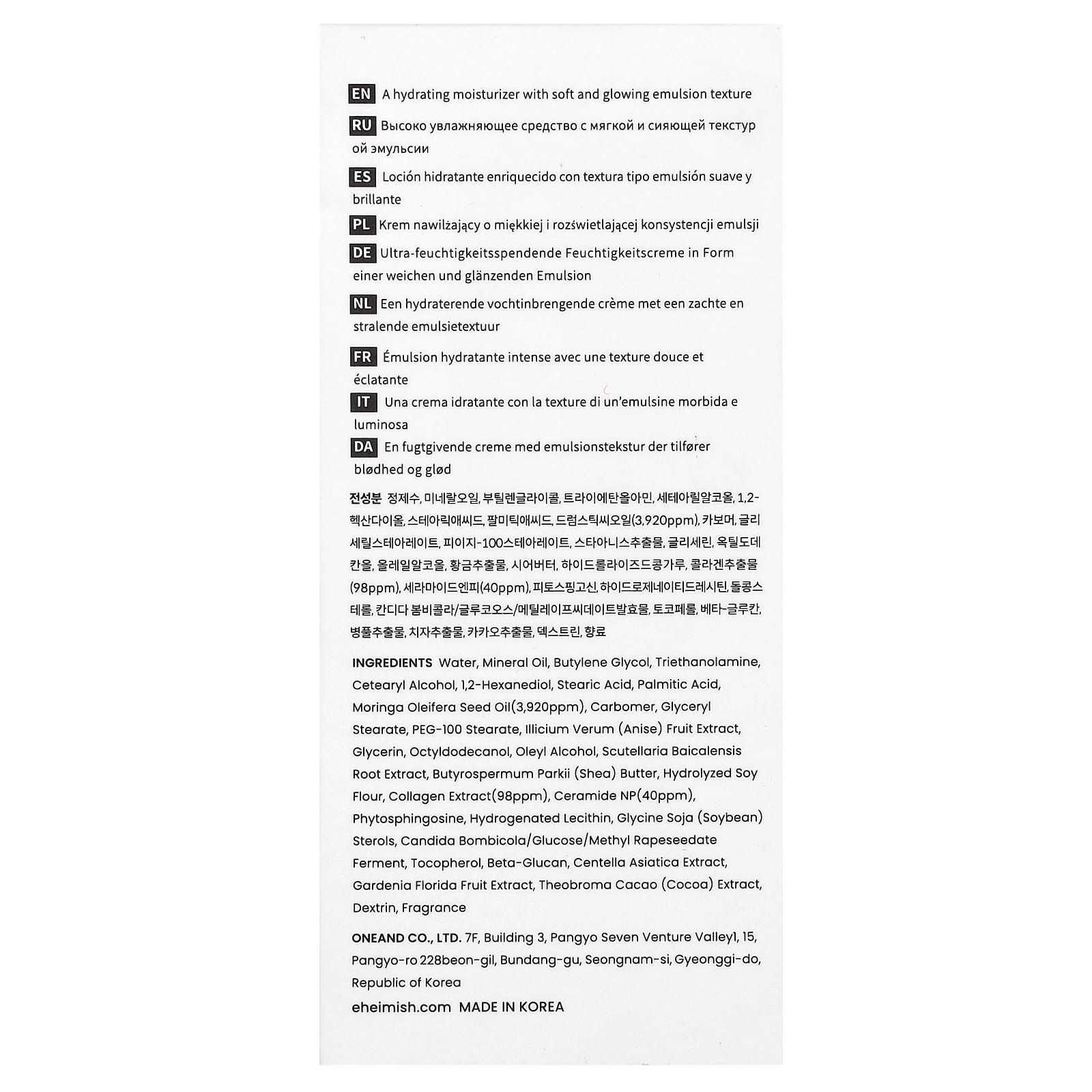 Вода, минерального масла, бутиленгликоль, триэтаноламин, цетеариловый спирт, 1,2-гександиол, стеариновая кислота, пальмитиновая кислота, масло семян моринги (Moringa oleifera) (3920 част./млн), карбомер, глицерил стеарат, ПЭГ-100 стеарат, экстракт плодов аниса звездчатого (Illicium verum), глицерин, октилдодеканол, олеиловый спирт, экстракт корня шлемника (Scutellaria baicalensis), масло ши (Butyrospermum parkii), гидролизованная соевая мука, экстракт коллагена (98 част./млн), керамид NP (40 част./млн), фитосфингозин, гидрогенизированный лецитин, стеролы сои (Glycine soja), кандида бомбикола (Candida bombicola)/глюкоза/фермент метила рапса, токоферол, бета-глюкан, экстракт готу колы (Centella asiatica), экстракт плодов гардении жасминовидной (Gardenia florida), экстракт какао (Theobroma cacao), декстрин, отдушка.