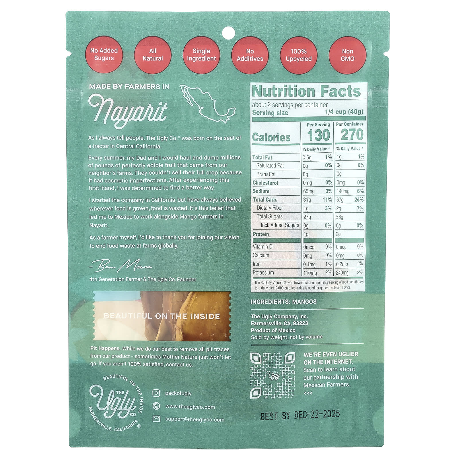 Эта полезная закуска полностью натуральная, без добавления сахара, добавок и консервантов. Использование свежего манго с ферм в Мексике. Все наши продукты на 100% переработаны, а каждый пакет предотвращает выбросы манго весом 2,25 фунта!