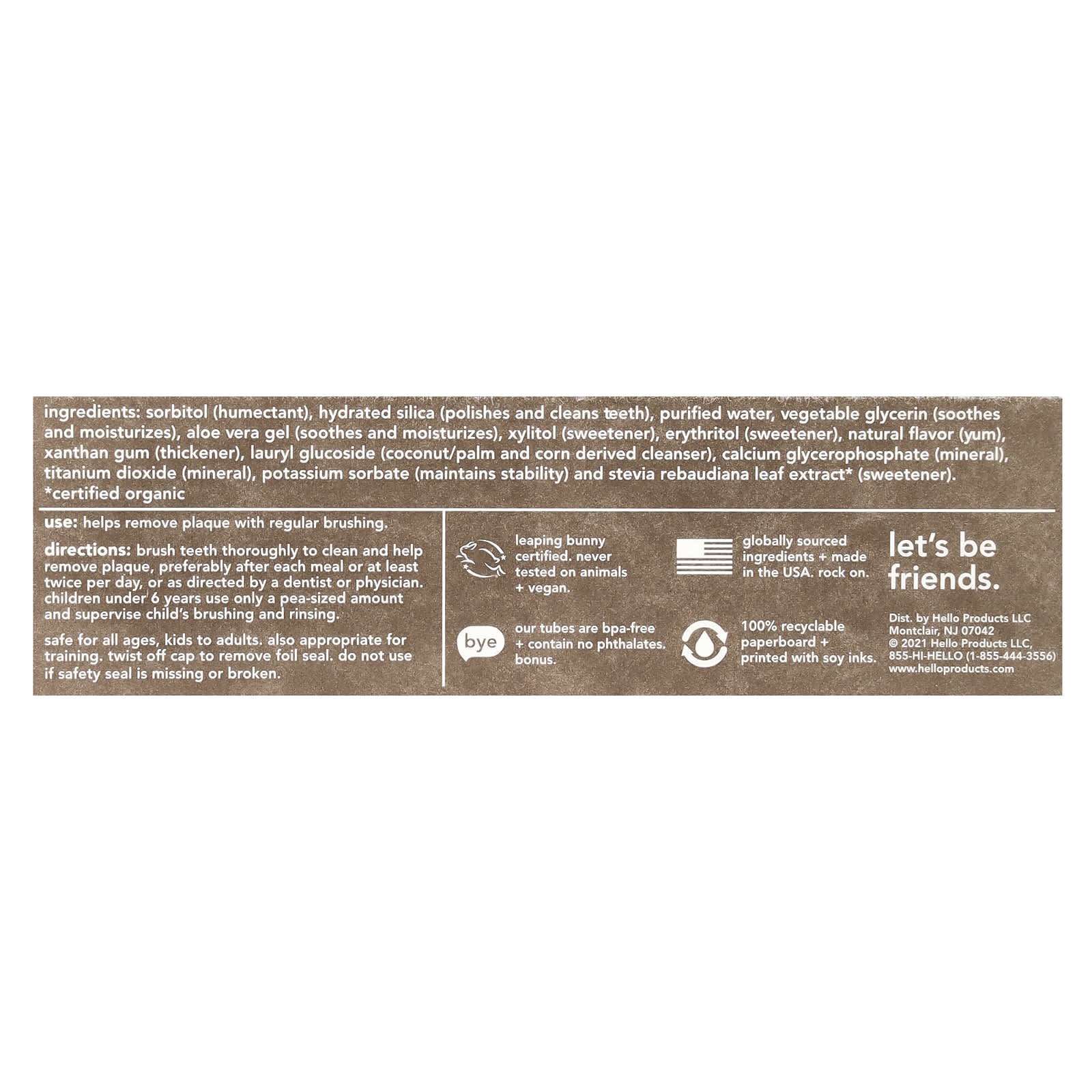 Сорбит (увлажнитель), гидратированный диоксид кремния (полирует и очищает зубы), очищенная вода, растительный глицерин (успокаивает и увлажняет), гель алоэ вера (успокаивает и увлажняет), ксилитол (подсластитель), эритритол (подсластитель), натуральный ароматизатор (ням), ксантановая камедь (загуститель), лаурил глюкозид (очищающее средство из кокоса, пальмы и кукурузы), глицерофосфат кальция (минеральный), диоксид титана (минеральный), сорбат калия (сохраняет стабильность) и экстракт листьев стевии (Stevia rebaudiana) * (подсластитель).