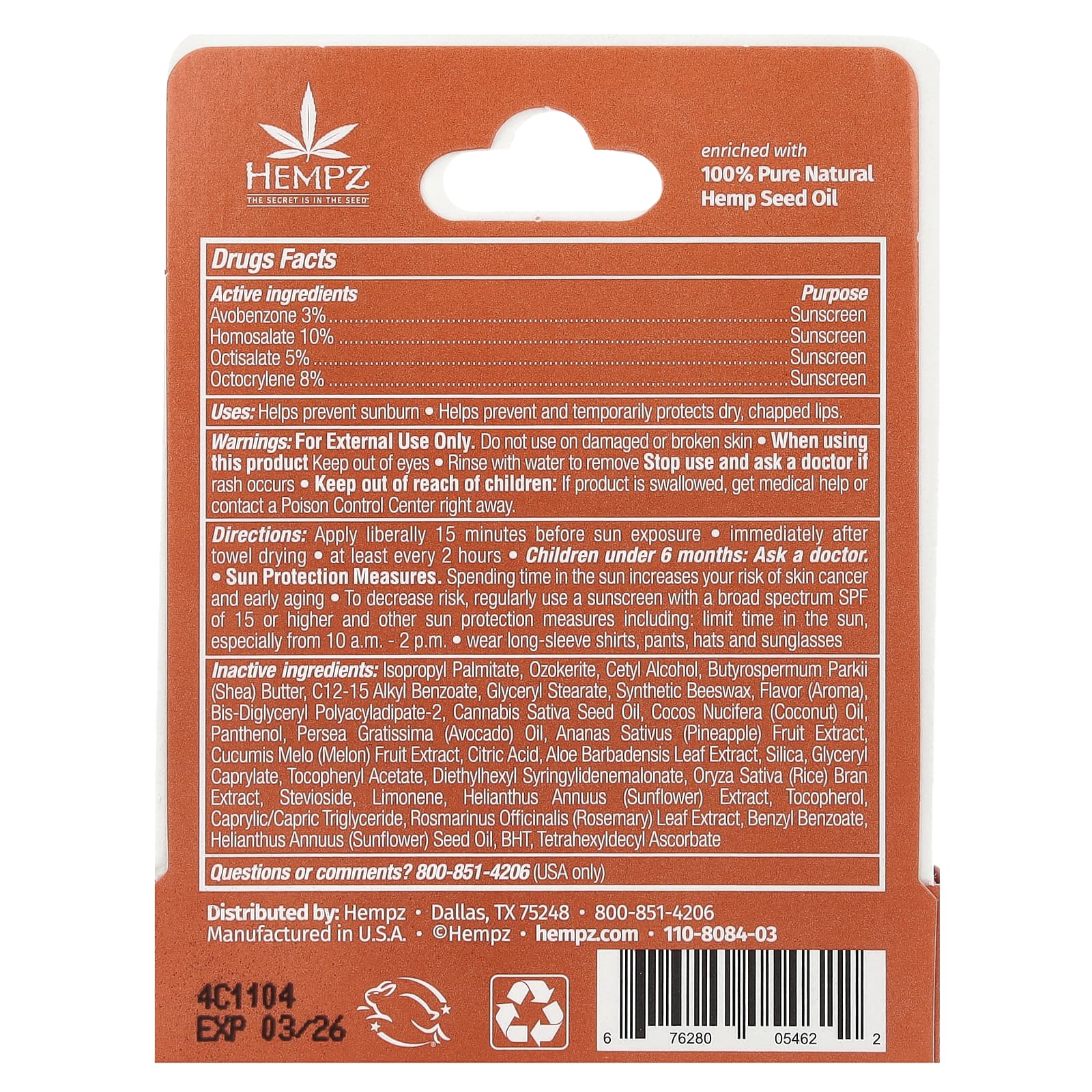 | Вспомогательные ингредиенты: Изопропилпальмитат, озокерит, цетиловый спирт, масло ши (Butyrospermum parkii), c12-15-алкилбензоат, глицерил стеарат, синтетический пчелиный воск, ароматизатор, бис-диглицерил полиациладипат-2, масло семян конопли, кокосовое масло д. экстракт отрубей, стевиозид, лимонен, экстракт подсолнечника (Helianthus annuus), токоферол, каприловый / каприновый триглицерид, экстракт листьев розмарина (Rosmarinus officinalis), бензилбензоат, масло семян подсолнечника (Helianthus annuus), тетрагексилдецил аскорбат. | |