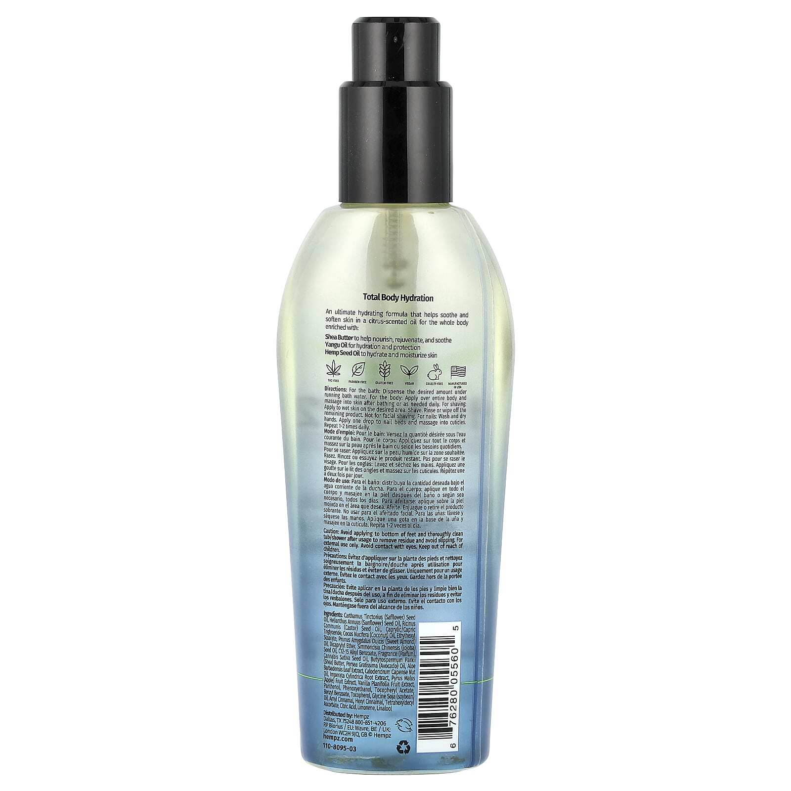семена сафлора (Carthamus tinctorius), подсолнечное масло (Helianthus annuus), касторовое масло (Ricinus communis), каприловый/каприновый триглицерид, кокосовое масло (Cocos nucifera), этилгексил стеарат, масло сладкого миндаля (Prunus amygdalus dulcis), дикаприлиловый эфир, масло из семян жожоба (Simmondsia chinensis), c12-15 алкил бензоат, отдушка (парфюмерная композиция), конопляное масло (Cannabis sativa), масло ши (Butyrospermum parkii), масло авокадо (Persea gratissima), экстракт листьев алоэ вера (Aloe barbadensis), масло из орехов календулы (Calodendrum capense), экстракт корня императы циллиндрической (Imperata cylindrica), экстракт яблока (Pyrus malus), экстракт ванили (Vanilla planifolia), пантенол, феноксиэтанол, токоферилацетат, бензилбензоат, токоферол, соевое масло (Glycine soja), амилциннамаль, гексил циннамал, тетрагексилдецил аскорбат, лимонная кислота, лимонен, линалоол.