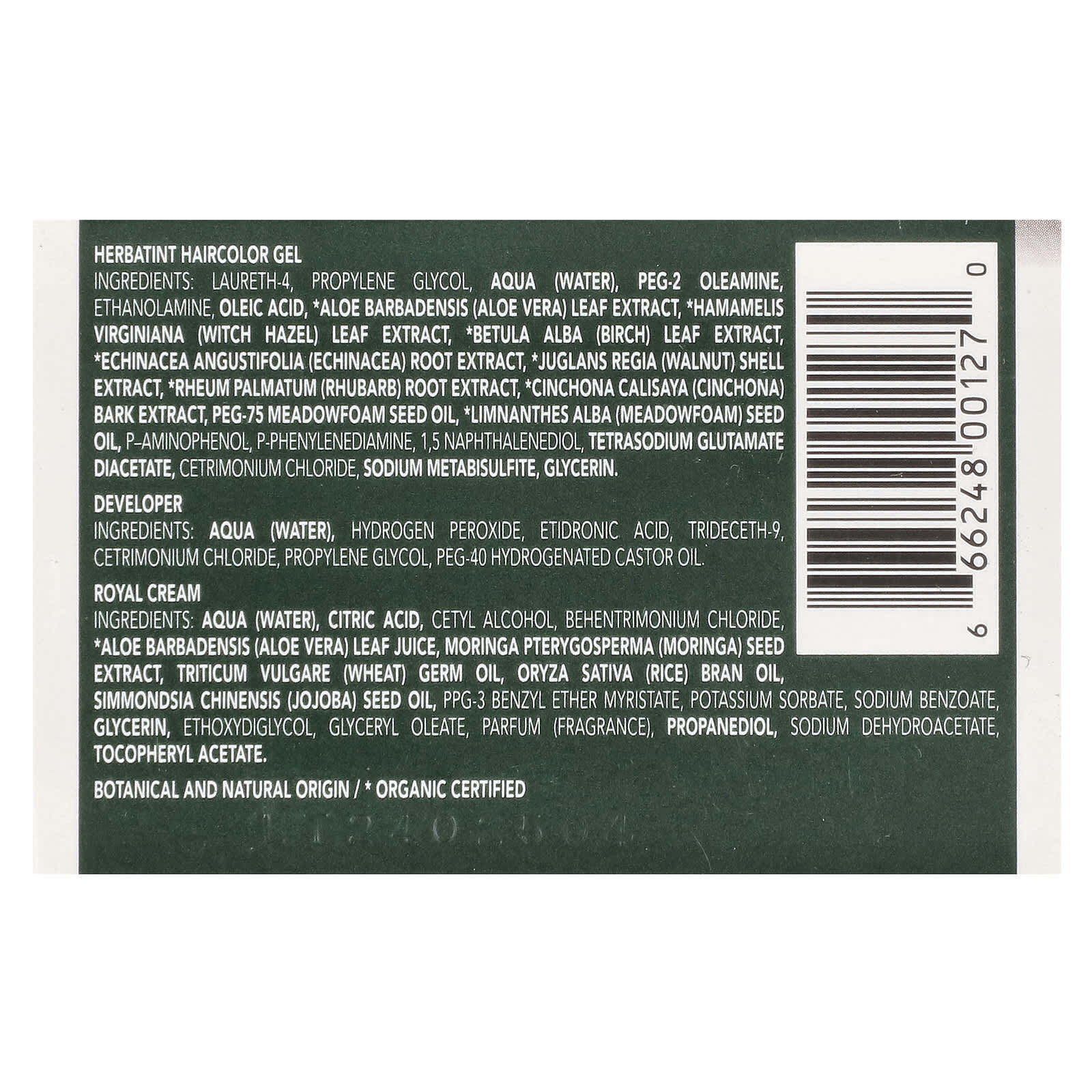Herbatint гель для волос: лаурет-4, пропиленгликоль, аква (вода), олово-олеамин , олеиновая кислота , олеиновая кислота, экстракт листьев алоэ-барбаденсиса (алоэ вера), экстракт листьев hamamelis virginiana (ведьмы), * betula alba ( экстракт из березы) * экстракт корня экхинацеи (эклинацея), * экстракт кожгалантереи (грецкий орех), экстракт корня ревма (ревень), экстракт корня экстракт, * cinchona calisaya (cinchona) экстракт коры, копье-75 масло лугового пена, * limnanthes alba (пенопласт) , п-аминофенол, п-фенилендиамин, 1,5-нафталиндиол, тетранатрий-эдта, хлорид цетримония, симетикон, метабисульфит натрия, глицерин.