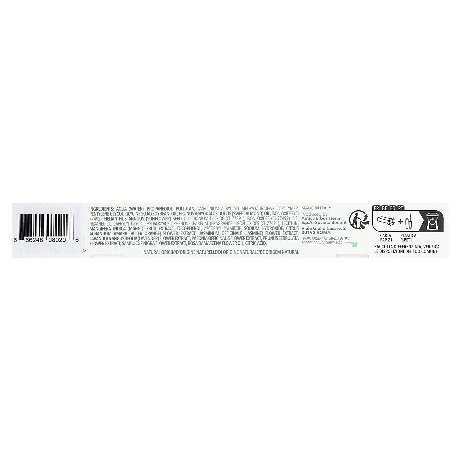 Вода (Aqua), пропандиол, пуллулан, аммоний акрилоилдиметилтаурат/ВП сополимер, пентилен гликоль, соевое масло (Glycine soja), масло сладкого миндаля (Prunus amygdalus dulcis), оксиды железа (CI 77492), подсолнечное масло (Helianthus annuus), диоксид титана (CI 77891), оксиды железа (CI 77499), 1,2-гександиол, каприлилгликоль, гидроксиацетофенон, парфюмерная композиция (отдушка), оксиды железа (CI 77491), лецитин, экстракт плодов манго (Mangifera indica), токоферол, аскорбил пальмитат, гидроксид натрия, экстракт цветков горького апельсина (Citrus aurantium amara), экстракт цветков жасмина (Jasminum officinale), экстракт цветков лаванды (Lavandula angustifolia), экстракт цветков пиона (Paeonia officinalis), экстракт цветков сакуры мелкопильчатой (Prunus serrulata), экстракт цветков бузины (Sambucus nigra), масло из цветков дамасской розы (Rosa damascena), лимонная кислота.