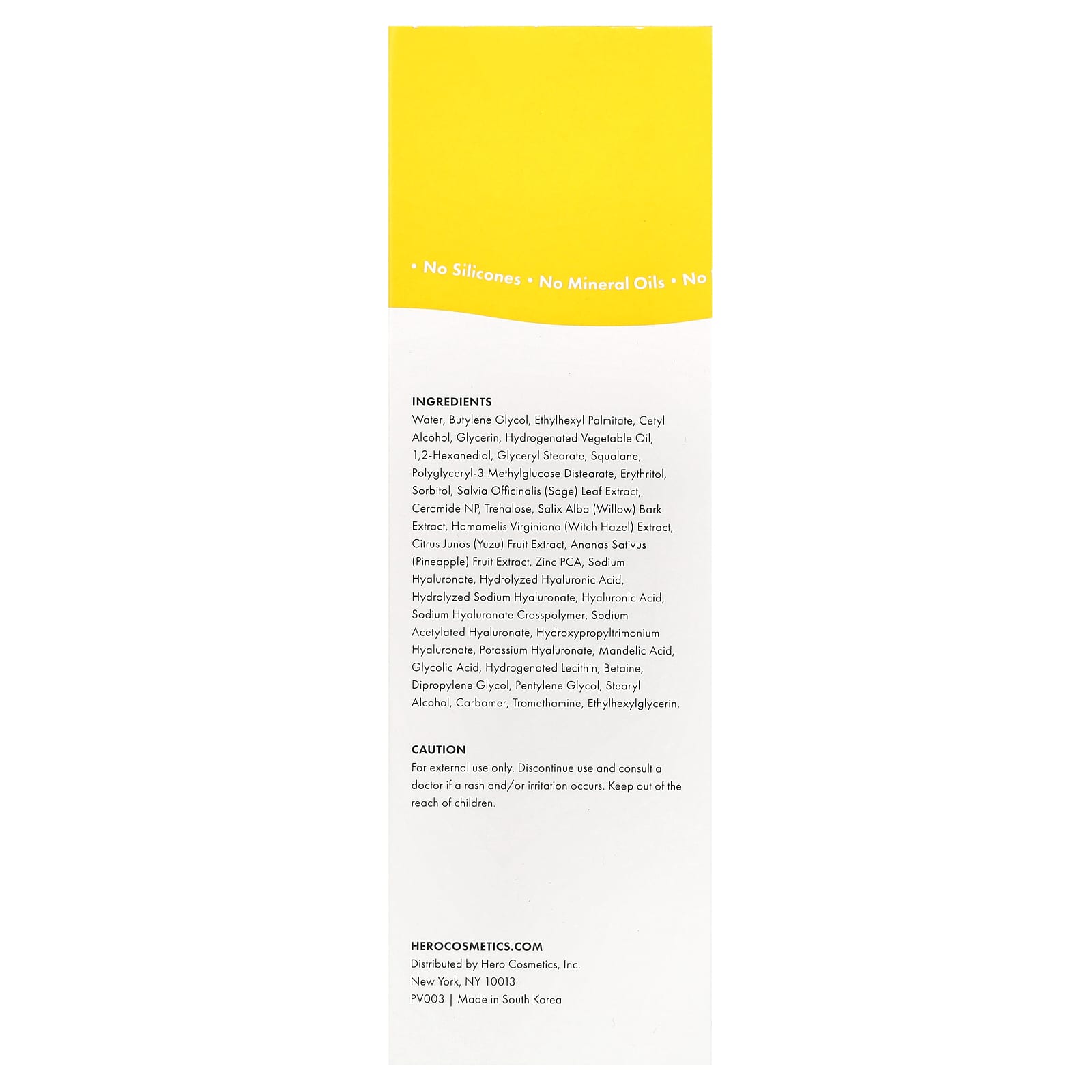 Вода, бутиленгликоль, этилгексил пальмитат, цетиловый спирт, глицерин, гидрогенизированное растительное масло, 1,2-гександиол, глицерил стеарат, сквалан, полиглицерил-3 метилглюкозы дистеарат, эритритол, сорбитол, экстракт листьев шалфея (Salvia officinalis), керамид NP, трегалоза, экстракт коры ивы (Salix alba), экстракт гамамелиса (Hamamelis virginiana), экстракт плодов юдзу (Citrus junos), экстракт плодов ананаса (Ananas sativus), цинк PCA, гиалуронат натрия, гидролизованная гиалуроновая кислота, гидролизованный гиалуронат натрия, гиалуроновая кислота, гиалуронат натрия кроссполимер, ацетилированный гиалуронат натрия, гидроксипропилтримония гиалуронат, гиалуронат калия, миндальная кислота, гликолевая кислота, гидрогенизированный лецитин, бетаин, дипропиленгликоль, пентилен гликоль, стеариловый спирт, карбомер, трометамин, этилгексилглицерин.