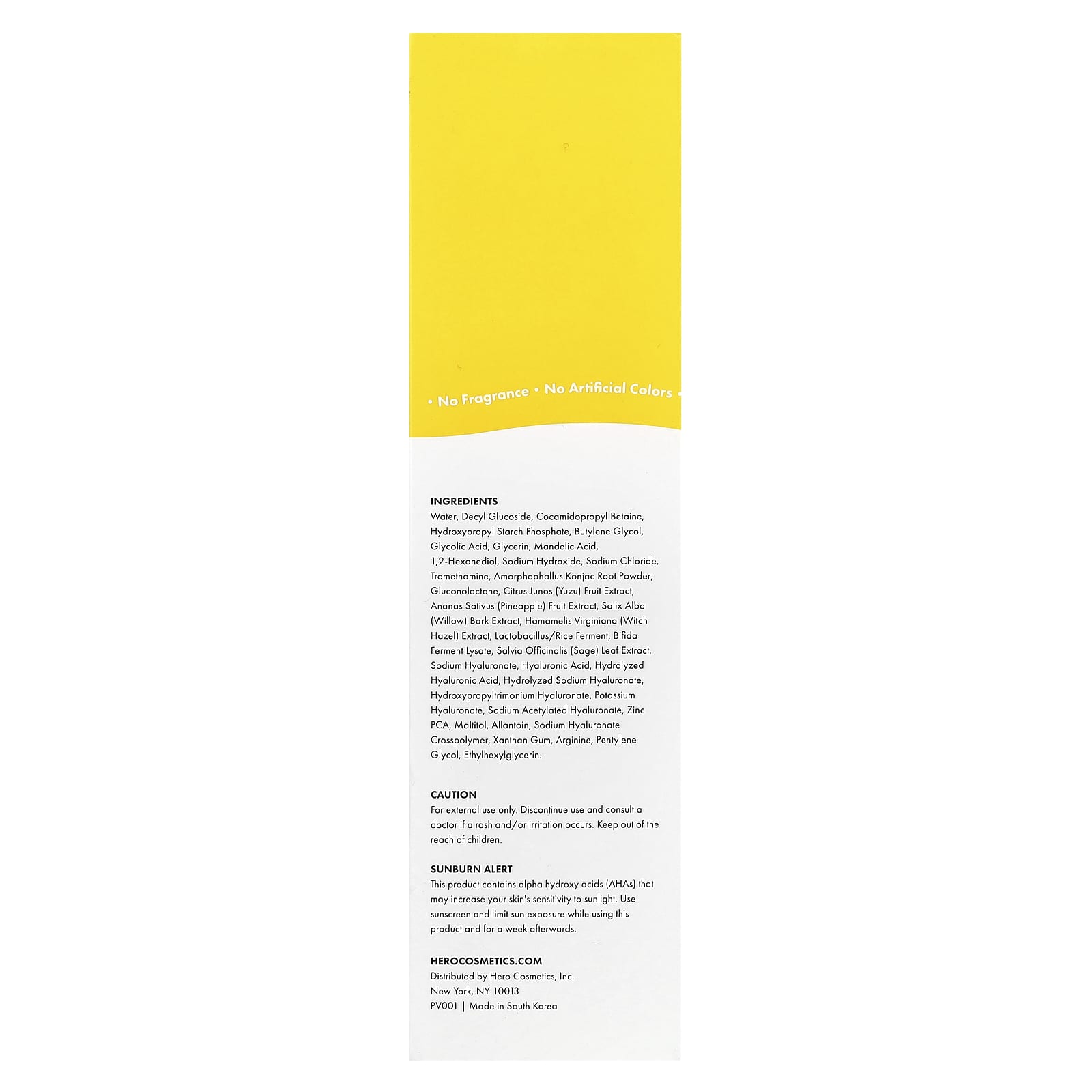 Вода, децил глюкозид, кокамидопропилбетаин, гидроксипропил фосфат крахмала, бутиленгликоль, гликолевая кислота, глицерин, миндальная кислота, 1,2-гександиол, гидроксид натрия, хлорид натрия, трометамин, порошок из корня конжака (Amorphophallus konjac), глюконолактон, экстракт плодов юдзу (Citrus junos), экстракт плодов ананаса (Ananas sativus), экстракт коры ивы (Salix alba), экстракт гамамелиса (Hamamelis virginiana), продукт ферментации бактерий Lactobacillus в присутствии риса, лизат ферментов бифидобактерий, экстракт листьев шалфея (Salvia officinalis), гиалуронат натрия, гиалуроновая кислота, гидролизованная гиалуроновая кислота, гидролизованный гиалуронат натрия, гидроксипропилтримония гиалуронат, гиалуронат калия, ацетилированный гиалуронат натрия, цинк PCA, мальтит, аллантоин, гиалуронат натрия кроссполимер, ксантановая камедь, аргинин, пентилен гликоль, этилгексилглицерин.