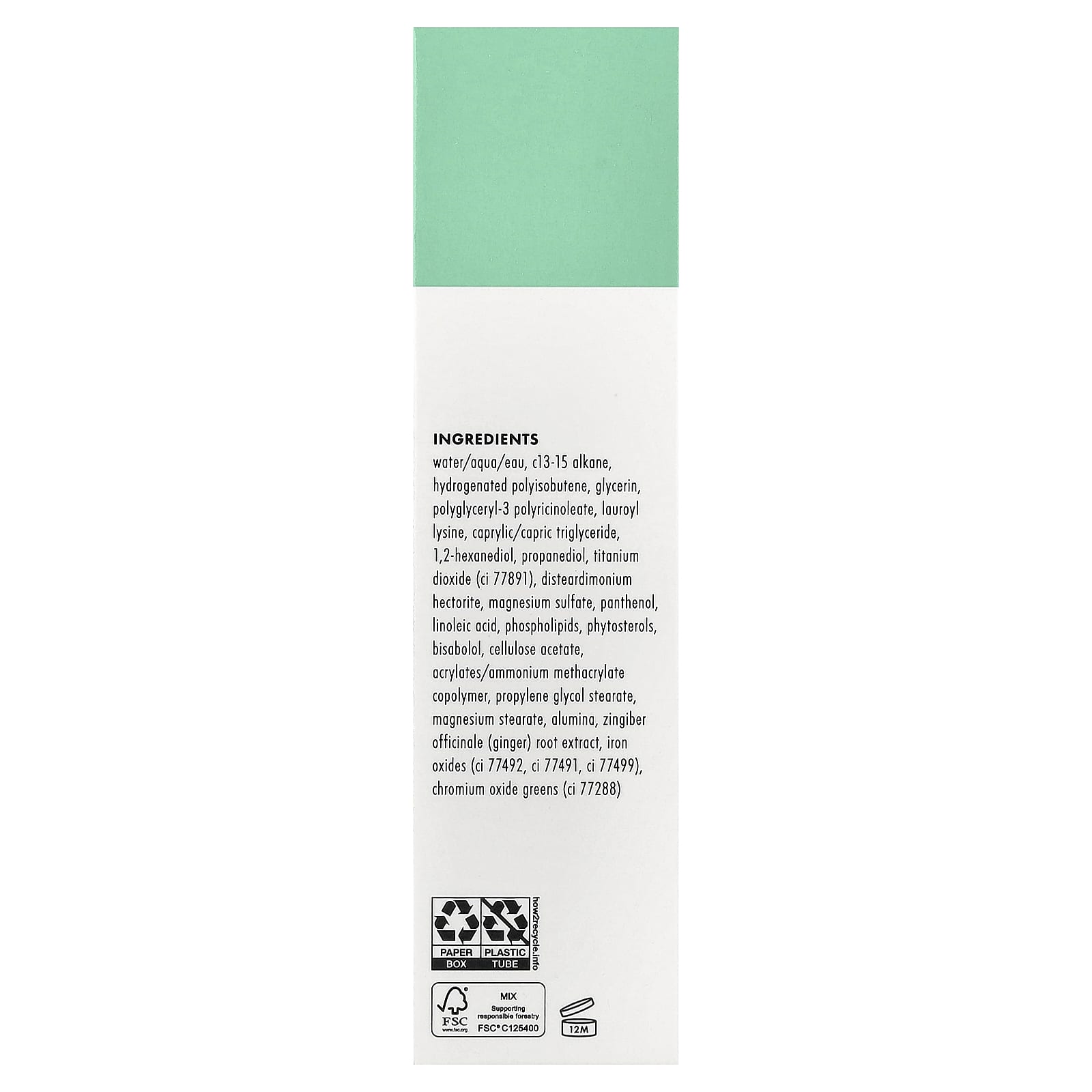 Вода (eau), c13-15 алкан, гидрогенизированный полиизобутен, глицерин, полиглицерил-3 полирицинолеат, лаурил лизин, каприловый/каприновый триглицерид, 1,2-гександиол, пропандиол, диоксид титана (CI 77891), дистеардимония гекторит, сульфат магния, пантенол, линолевая кислота, фосфолипидов, фитостеролы, бисаболол, ацетат целлюлозы, акрилат/аммоний метакрилат сополимер, пропиленгликоль стеарат, стеарат магния, оксид алюминия, экстракт корня имбиря (Zingiber officinale), оксиды железа (CI 77492, CI 77491, CI 77499), зелень с оксидом хрома (CI 77288).