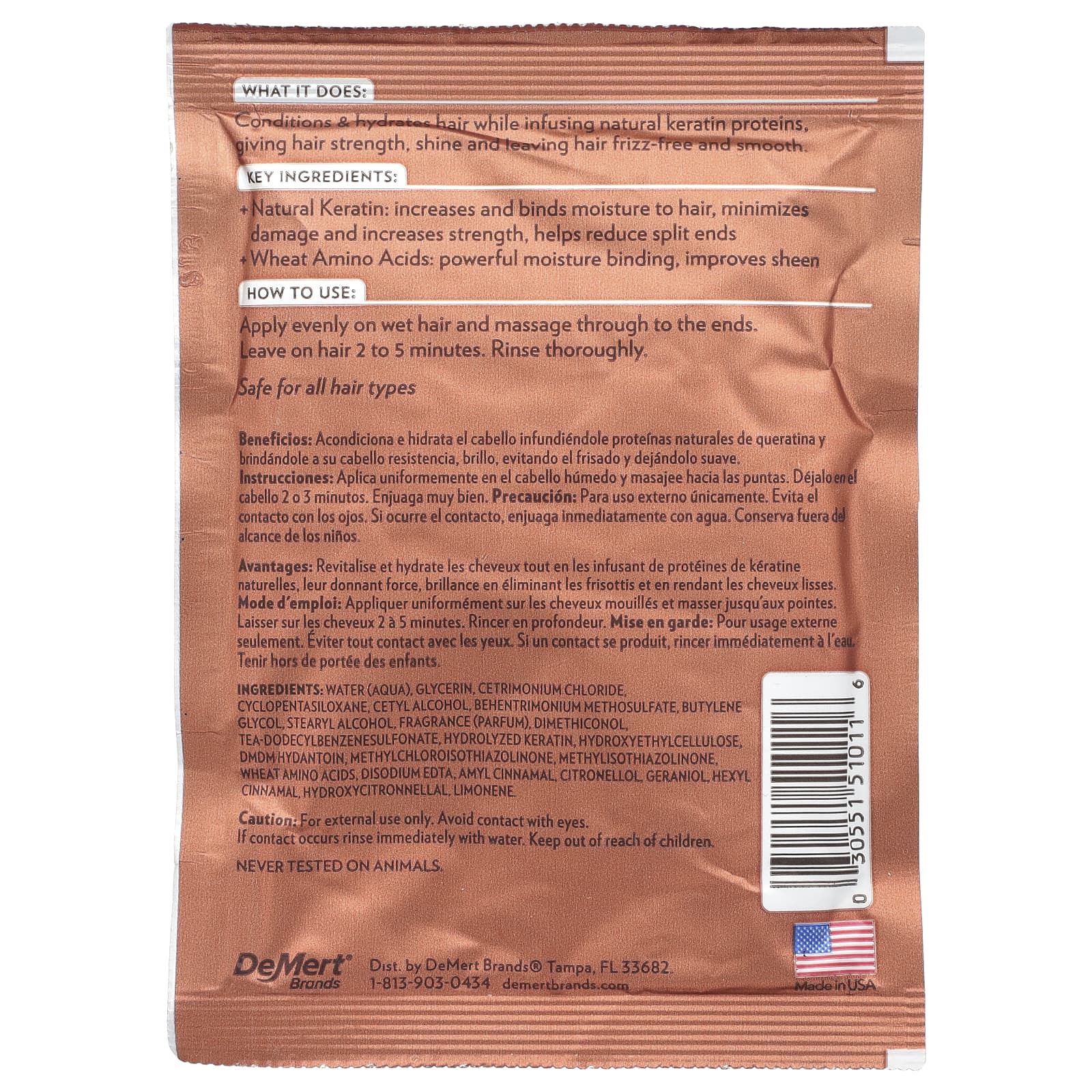 Действие. Кондиционирует и увлажняет волосы, насыщая их натуральными протеинами кератина, придавая волосам силу и блеск, расчесывая и разглаживая