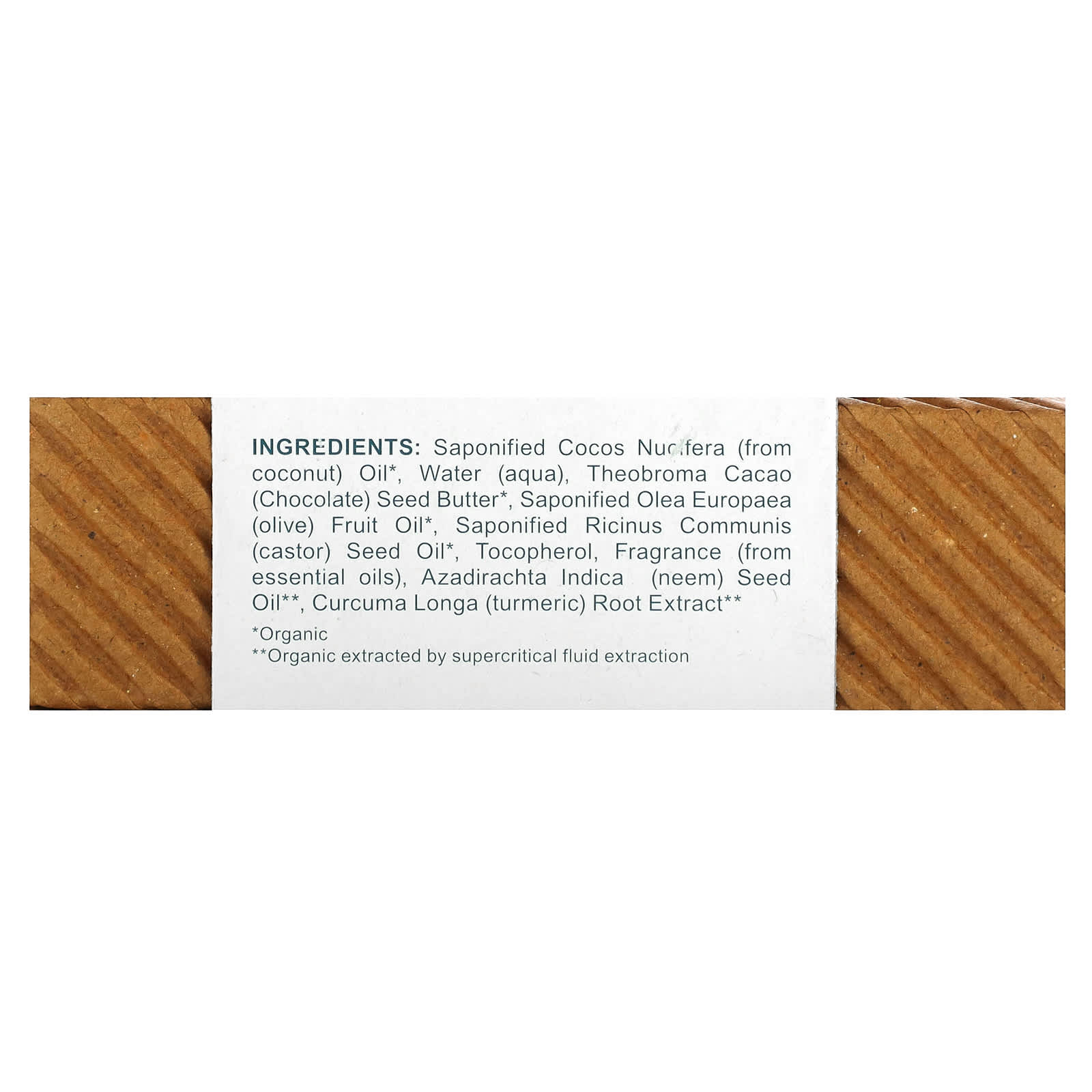 Омыленное кокосовое масло (Cocos nucifera) *, вода (Aqua), масло из семян какао (Theobroma) *, омыленное масло из плодов оливы (Olea europaea) *, омыленное касторовое масло (Ricinus communis) *, токоферол, отдушка (из эфирных масел), масло семян нима (Azadirachta indica) **, экстракт корня куркумы (Curcuma longa) **.