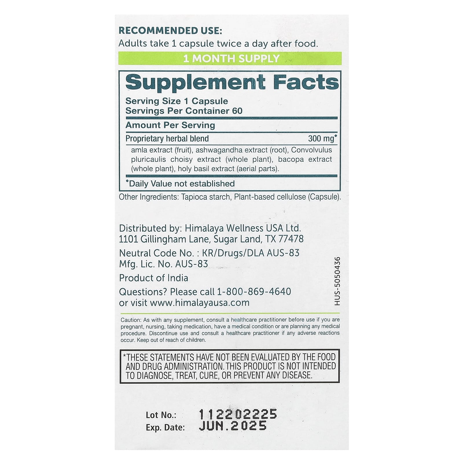 | amla extract (fruit), ashwagandha extract (root), Convolvulus pluricaulis choisy extract (whole plant), bacopa extract (whole plant), holy basil extract (aerial parts). | ||