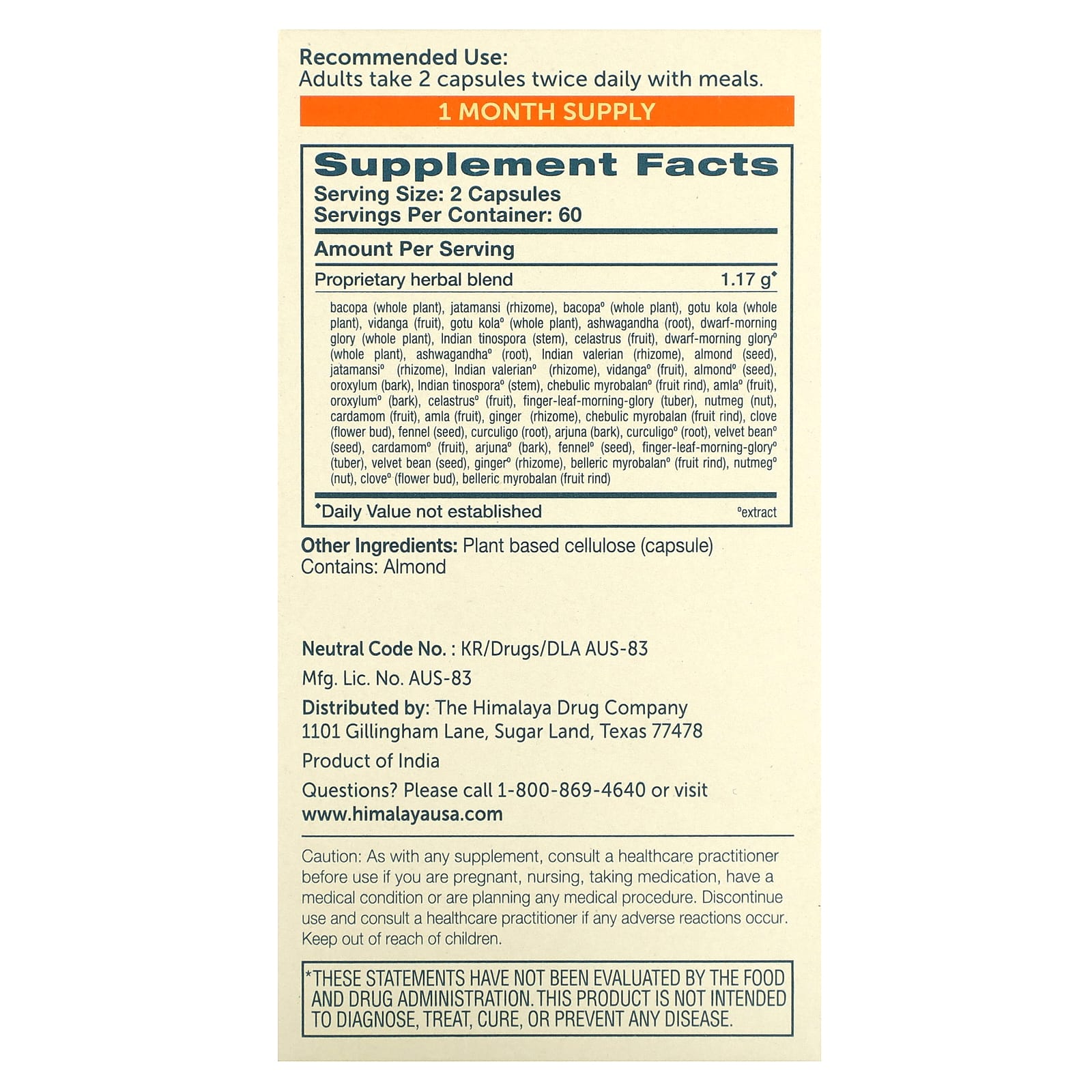 | Запатентованная травяная смесь бакопа (цельное растение), джатаманси (корневище), бакопа (цельное растение), готу кола (цельное растение), виданга (плод), готу кола ° (цельное растение), ашваганда (корень), карликовая ипомея (цельное растение) , Индийская тиноспора (стебель), селаструс (плод), карликовая ипомея ° (целое растение), ашвагандаº (корень), индийская валериана (корневище), миндаль (семена), джатамансиº (корневище), индийская валерианаº (корневище), виданга ° (плоды), миндальº (семена), ороксил (кора), индийская тиноспора (стебель), чебуличный миробалан (кожура плода), амлаº (плод), ороксил (кора), целаструсº (плод), пальчиковый лист слава (клубень), мускатный орех (орех), кардамон (плоды), амла (плоды), имбирь (корневище), чебулич миробалан (кожура плода), гвоздика (бутон цветка), фенхель (семена), куркулиго (корень), арджуна ( кора), curculigo ° (корень), бархатная фасольº (семена), кардамонº (плоды), арджуна ° (кора), фенхель ° (семена), пальчиковый лист Moring-gloryº (клубень), бархатная фасоль (семена), имбирьº (корневище), беллерический миробаланº (кожура плода), мускатный орех ° (орех), гвоздикаº (бутон цветка), беллерический миробалан (ф. руит кожура) | 1,17 г | ♦ |