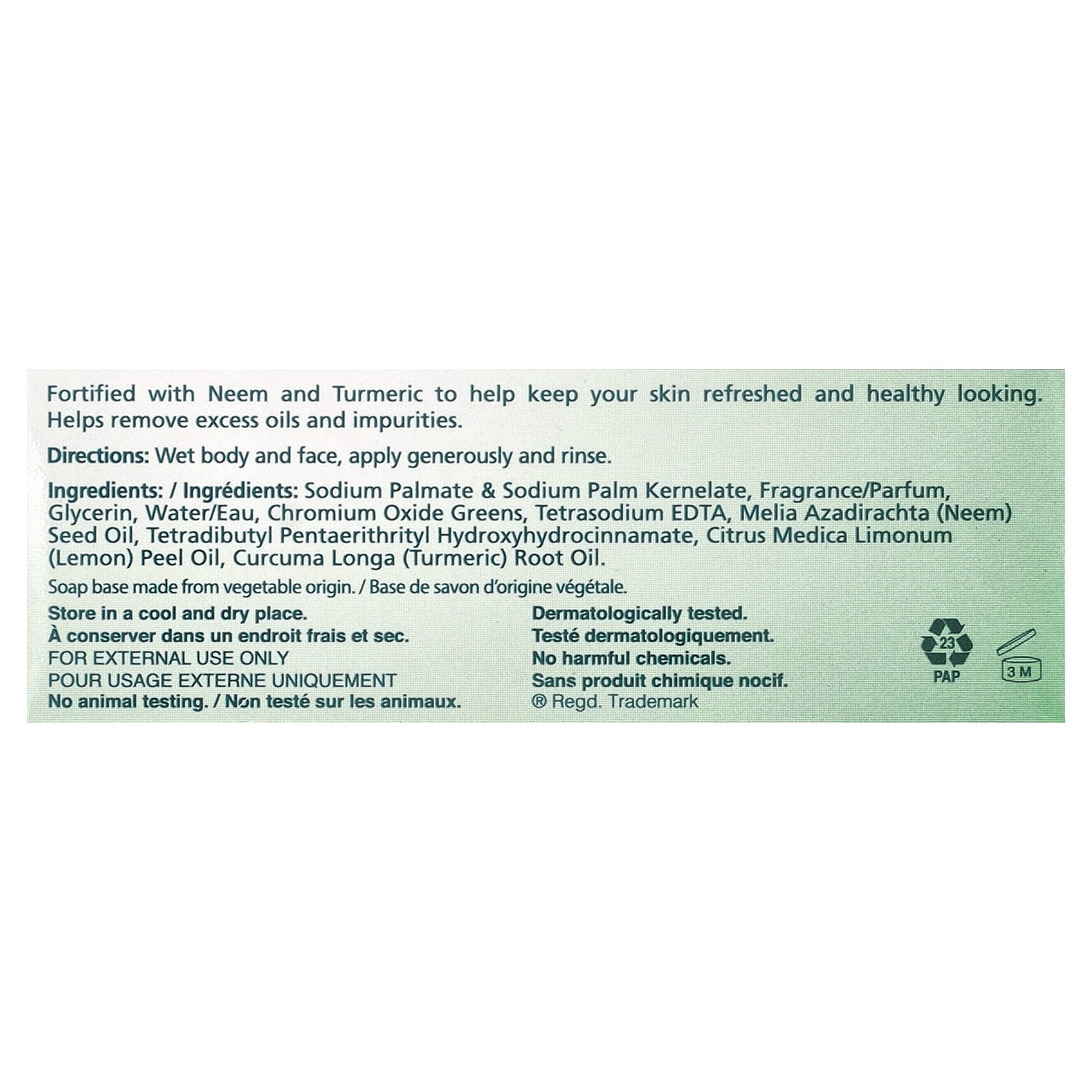 Пальмат натрия пальмовый кернелат натрия, отдушка, глицерин, вода (Eau), хромовая зелень, тетранатрия ЭДТК, масло из семян нима (Melia azadirachta), тетрадибутил пентаэритритил гидроксигидроциннамат, масло из цедры лимона (Citrus medica limonum), масло из корня куркумы (Curcuma longa).