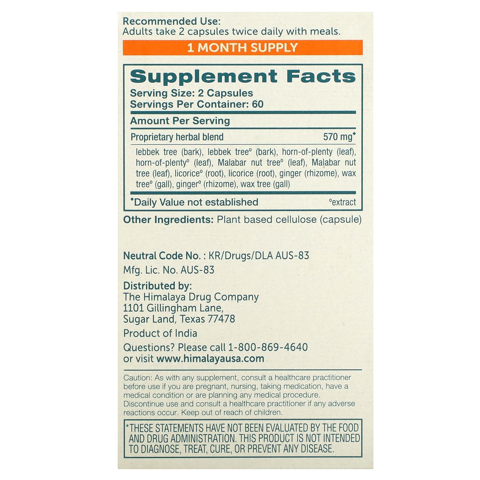 | Запатентованная травяная смесь дерево леббек (кора), дерево леббек ° (кора), рог изобилия (лист), рог изобилия (лист), орех малабар ° (лист), ореховое дерево малабар (лист), солодка ° ( корень), солодка (корень), имбирь (корневище), восковое дерево ° (желчь), имбирь ° (корневище), восковое дерево (желчь) | 570 мг | ♦ |