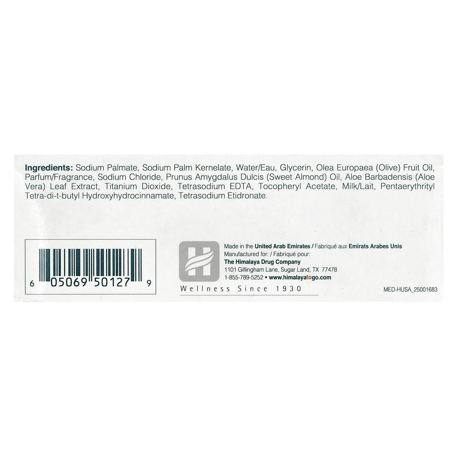 Пальмитат натрия, пальмовый кернелат натрия, вода (eau), глицерин, оливковое масло (Olea europaea), отдушка/парфюмерная композиция, хлорид натрия, масло сладкого миндаля (Prunus amygdalus dulcis), экстракт листьев алоэ вера (Aloe vera), диоксид титана, тетранатрия ЭДТК, токоферилацетат, молоко, пентаэритритил тетра-ди-трет-бутил гидроксигидроциннамат, тетранатрия этидронат.