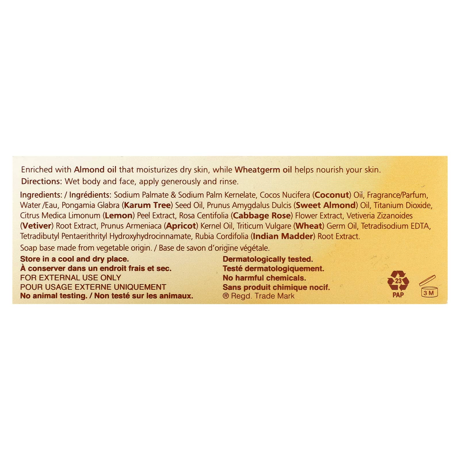 Пальмитат натрия, пальмовый кернерат натрия, кокосовое масло (Cocos nucifera), отдушка/парфюмерная композиция, вода, масло из семян дерева карум (Pongamia glabra), масло сладкого миндаля (Prunus amygdalus dulcis), диоксид титана, экстракт кожуры лимона (Citrus medica limonum), экстракт цветков капустной розы (Rosa centifolia), экстракт корня ветивера (Vetiveria zizanoides), масло из косточек абрикоса (Prunus armeniaca), масло зародышей пшеницы (Triticum vulgare), тетрадинатрий ЭДТ, тетрадибутил пентаэритритил гидроксигидроциннамат, экстракт корня марены индийской (Rubia cordifolia).