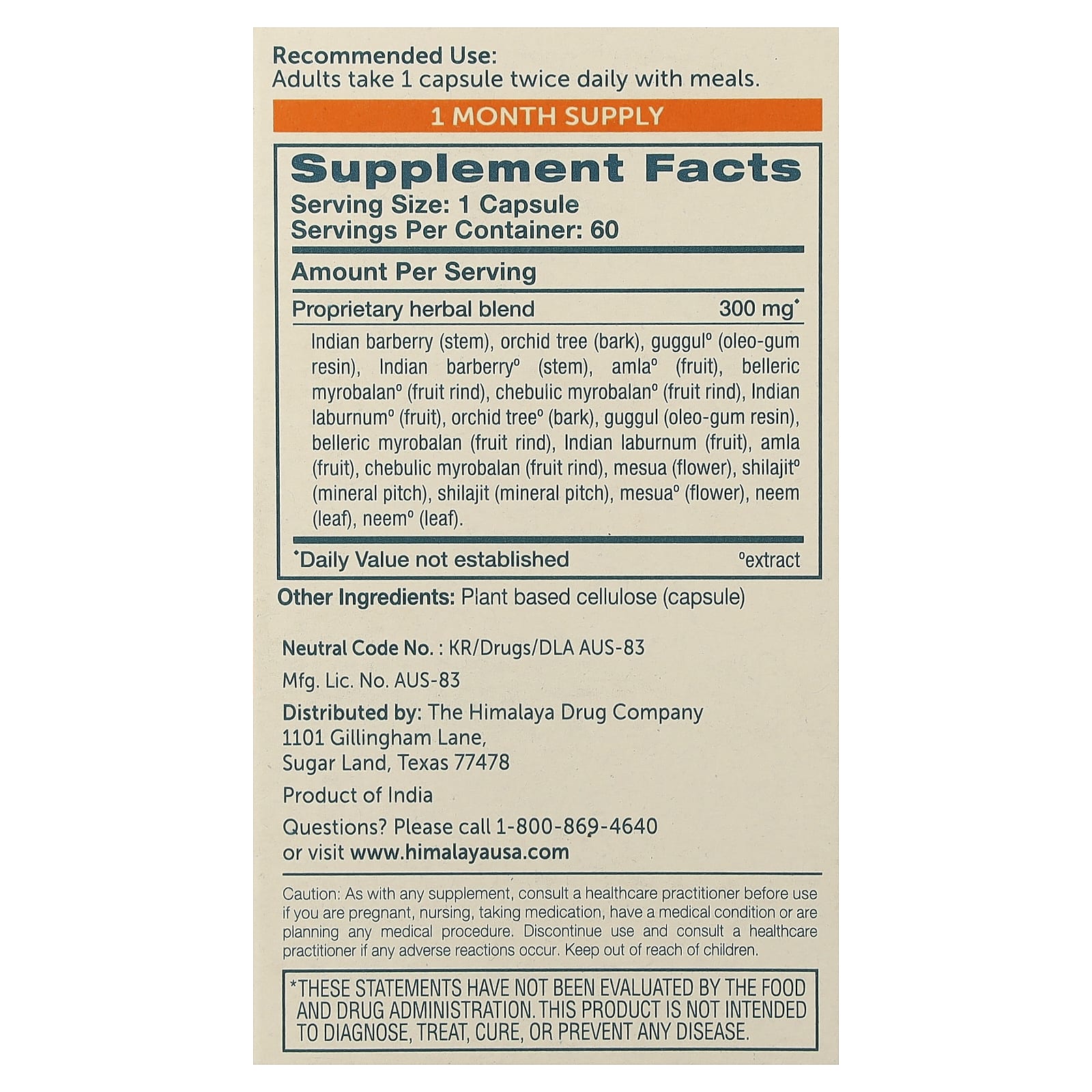 | Запатентованная травяная смесь Индийский барбарис (стебель), орхидея (кора), гуггулº (смола олеокамеди), индийский барбарисº (стебель), амлаº (плоды), бибхитаки (Belleric myrobalanº) (кожура плодов), чебулический миробаланº (кора плодов), индийский трутовикº (плоды) , кора орхидеиº, гуггул (олеосмола), миробалан бибхитаки (кожура плодов), ламинария (плоды) , мумие (минеральная смола), цветки месуаº, листья нима (листья), листья нимаº. | 300 мг | ♦ |