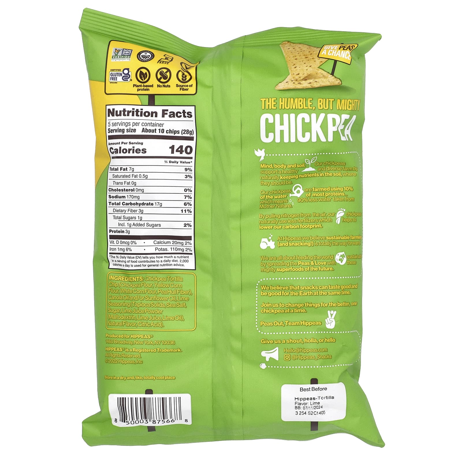 Чипсы из нутовой тортильи (нутовая мука, мука из желтой кукурузы, мука из белой кукурузы, клетчатка из патоки), рапсовое масло и/или подсолнечное масло, приправа с лаймом (сухая тапиока, морская соль, сахара, порошок из сока лайма (мальтодекстрин, сок лайма, масло лайма), натуральный ароматизатор, лимонная кислота).