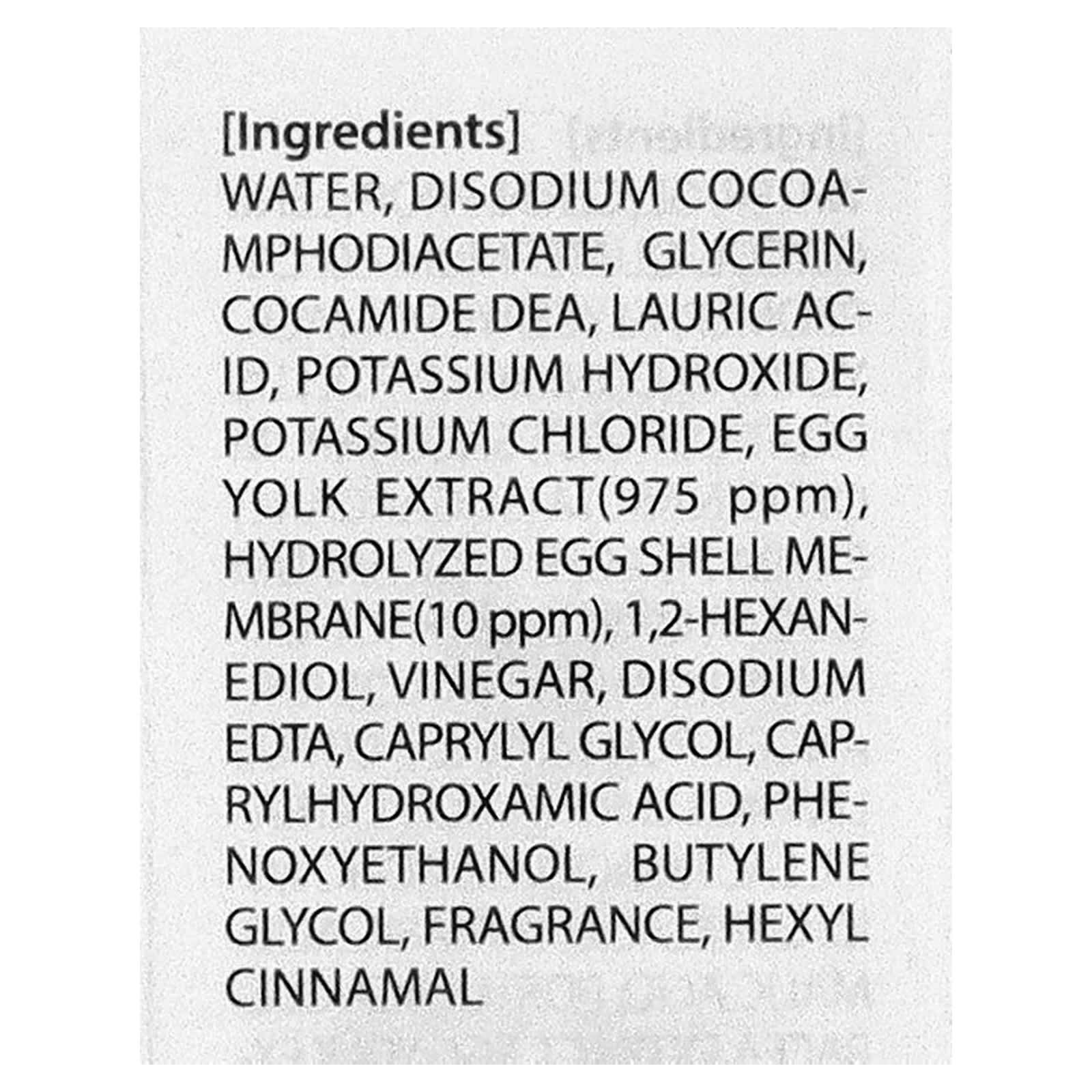 Вода, глицерин, пропиленгликоль, кватерний-60, карбомер, глицерил полиакрилат, экстракт плодов черники (Vaccinium myrtillus), экстракт сахарного тростника (Saccharum officinarum), экстракт сахарного клена (Acer saccharum), экстракт плодов апельсина (Citrus aurantium dulcis), экстракт плодов лимона (Citrus limon), молочная кислота, гликолевая кислота, лимонная кислота, винная кислота, яблочная кислота, экстракт портулака огородного (Portulaca oleracea), экстракт яичного желтка, гидролизованная мембрана яичной скорлупы, целлюлоза, 1,2-гександиол, уксус, двунатриевая ЭДТК, каприлилгликоль, каприлгидроксаминовая кислота, феноксиэтанол, бутиленгликоль, отдушка, гексил циннамал, бутилфенил метилпропиональ.