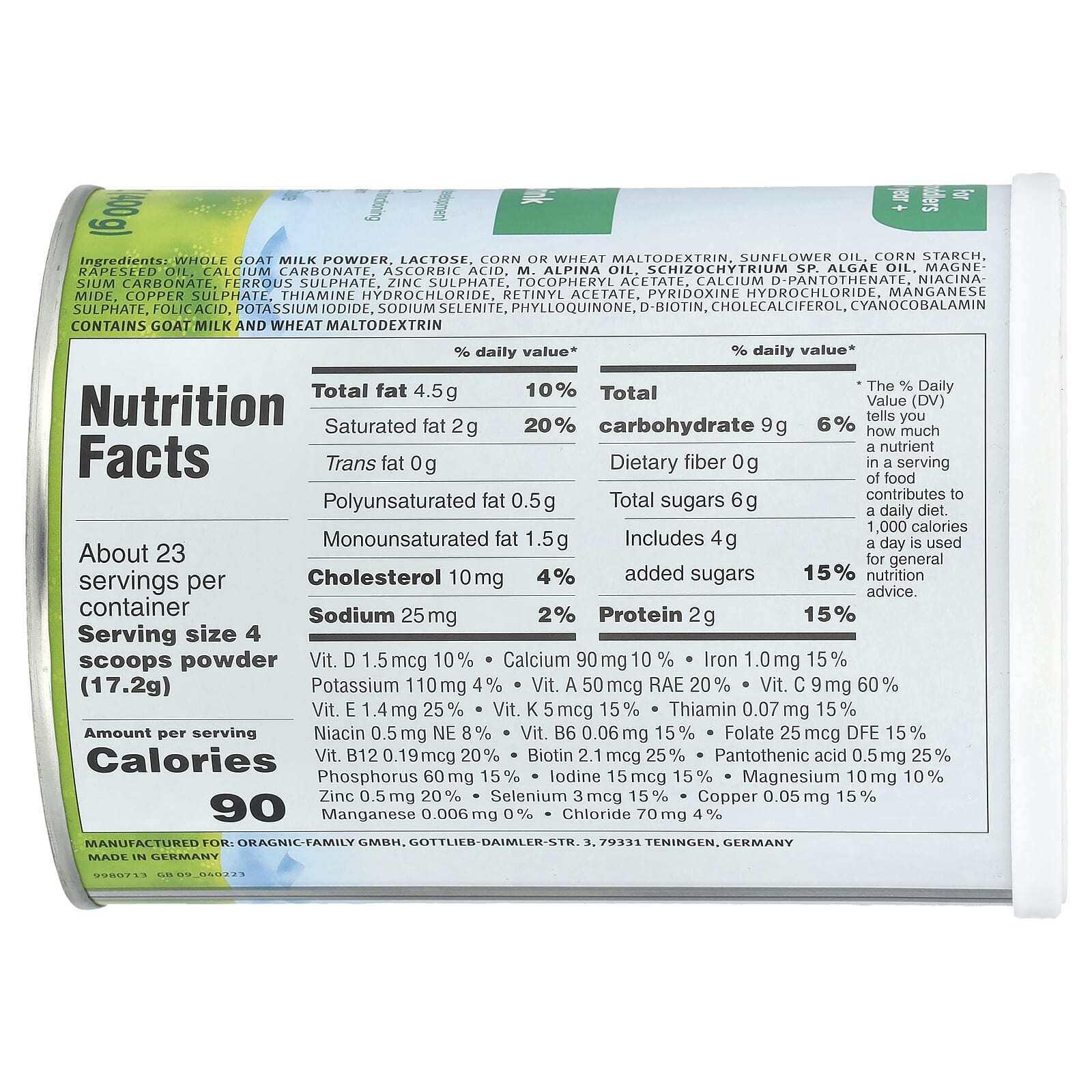 Сухое цельное козье молоко, лактоза, кукурузный или пшеничный мальтодекстрин, подсолнечное масло, кукурузный крахмал, рапсовое масло, карбонат кальция, аскорбиновая кислота, м. альпиновое масло, Schizochytrium sp. масло из водорослей, карбонат магния, сульфат железа, сульфат цинка, токоферилацетат, d-пантотенат кальция, никотинамид, сульфат меди, тиамина гидрохлорид, ретинилацетат, пиридоксина гидрохлорид, сульфат марганца, фолиевая кислота, йодид калия, селенит натрия, филлохинон, d-биотин, холекальциферол, цианокобаламин.
