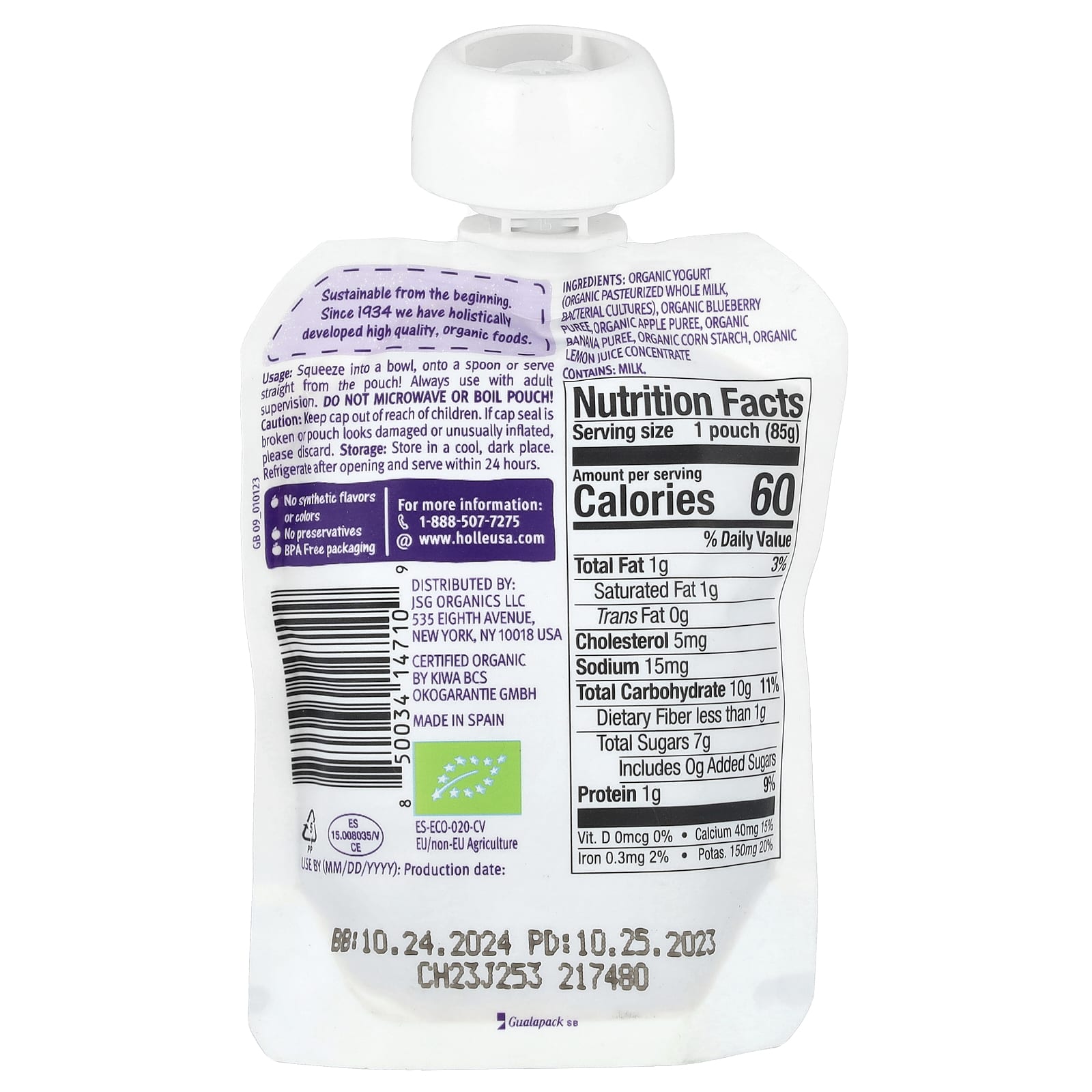 Органический йогурт (органическое пастеризованное цельное молоко, бактериальные культуры), органическое черничное пюре, органическое яблочное пюре, органическое банановое пюре, органический кукурузный крахмал, органический концентрат лимонного сока.