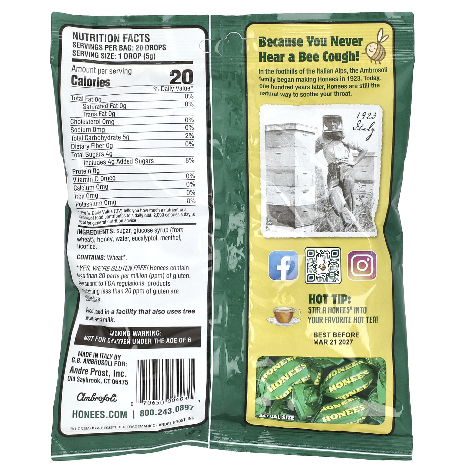 В предгорьях итальянских Альп семья Амброзоли начала производить леденцы Honees в 1923 г. Сегодня, сто лет спустя, мёд по-прежнему остаётся естественным средством, помогающим успокоить боль в горле.