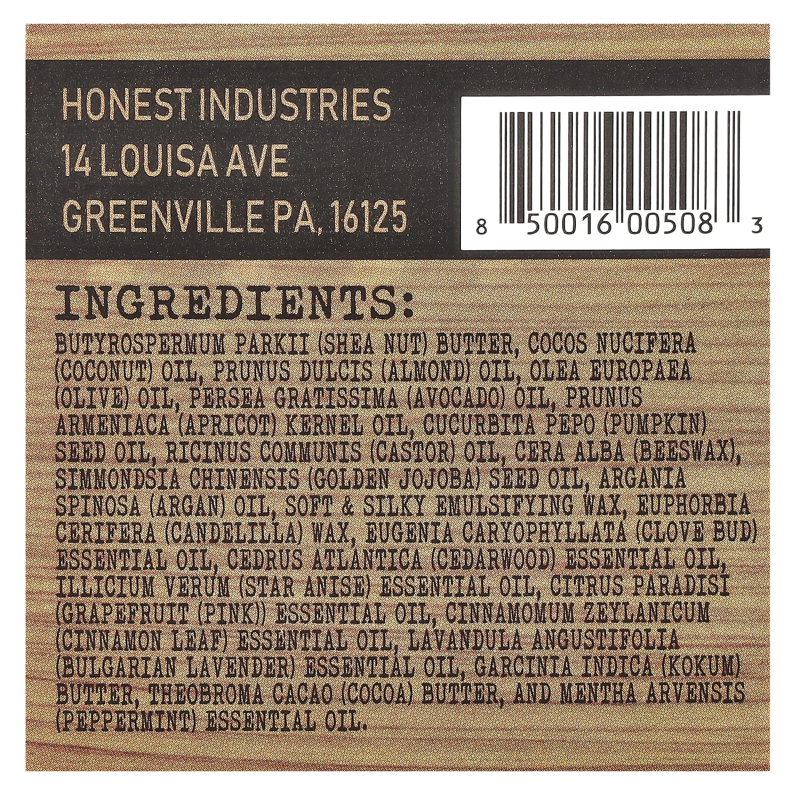 Масло ореха ши (Butyrospermum parkii), кокосовое масло (Cocos nucifera), миндальное масло (Prunus dulcis), Olea europaea (оливковое масло), масло авокадо (Persea gratissima), масло из косточек абрикоса (Prunus armeniaca), масло семян тыквы (Cucurbita pepo), касторовое масло (Ricinus communis), пчелиный воск, масло семян жожоба (Simmondsia chinensis), аргановое масло (Argania spinosa), мягкий & amp; шелковистый эмульгирующий воск, канделильский воск (Euphorbia cerifera), эфирное масло почек гвоздики (Eugenia caryophyllata), эфирное масло кедра (Cedrus atlantica), эфирное масло аниса (Illicium verum), эфирное масло грейпфрута (розовый) Citrus paradisi, Cinnamomum zeylanicum (листья корицы)) эфирное масло, эфирное масло болгарской лаванды (Lavandula angustifolia), масло кокум (Garcinia indica), масло какао (Theobroma cacao), эфирное масло перечной мяты (Mentha arvensis).