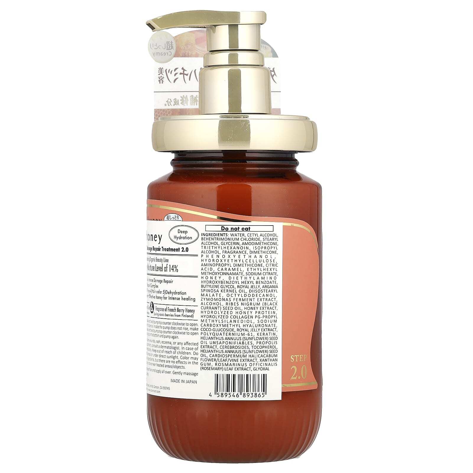 Вода, цетиловый спирт, бегентримония хлорид, стеариловый спирт, глицерин, амодиметикон, триэтилгексаноин, изопропиловый спирт, отдушка, диметикон, феноксиэтанол гидроксиэтилцеллюлоза, аминопропил диметикон, лимонная кислота, карамель, этилгексил метоксициннамат, цитрат натрия, мёд, диэтиламино гидроксибензоил гексилбензоат, бутиленгликоль, маточное молочко, аргановое масло (Argania spinosa), диизостеарил малат, октилдодеканол, экстракт фермента Zymomonas, спирт, масло семян черной смородины (Ribes nigrum), экстракт меда, гидролизованный медовый протеин, гидролизованный коллаген пг-пропил метилсиландиол, карбоксиметил гиалуронат натрия, кокоглюкозид, экстракт маточного молочка, поликватерниум-61, кератин, неомыляемые фракции подсолнечного масла (Helianthus annuus), экстракт прополиса, цереброзиды, токоферол, подсолнечное масло (Helianthus annuus), экстракт цветков/листьев/стеблей халикакаба (Cardiospermum halicacabum), ксантановая камедь, экстракт листьев розмарина (Rosmarinus officinalis), глиоксаль.