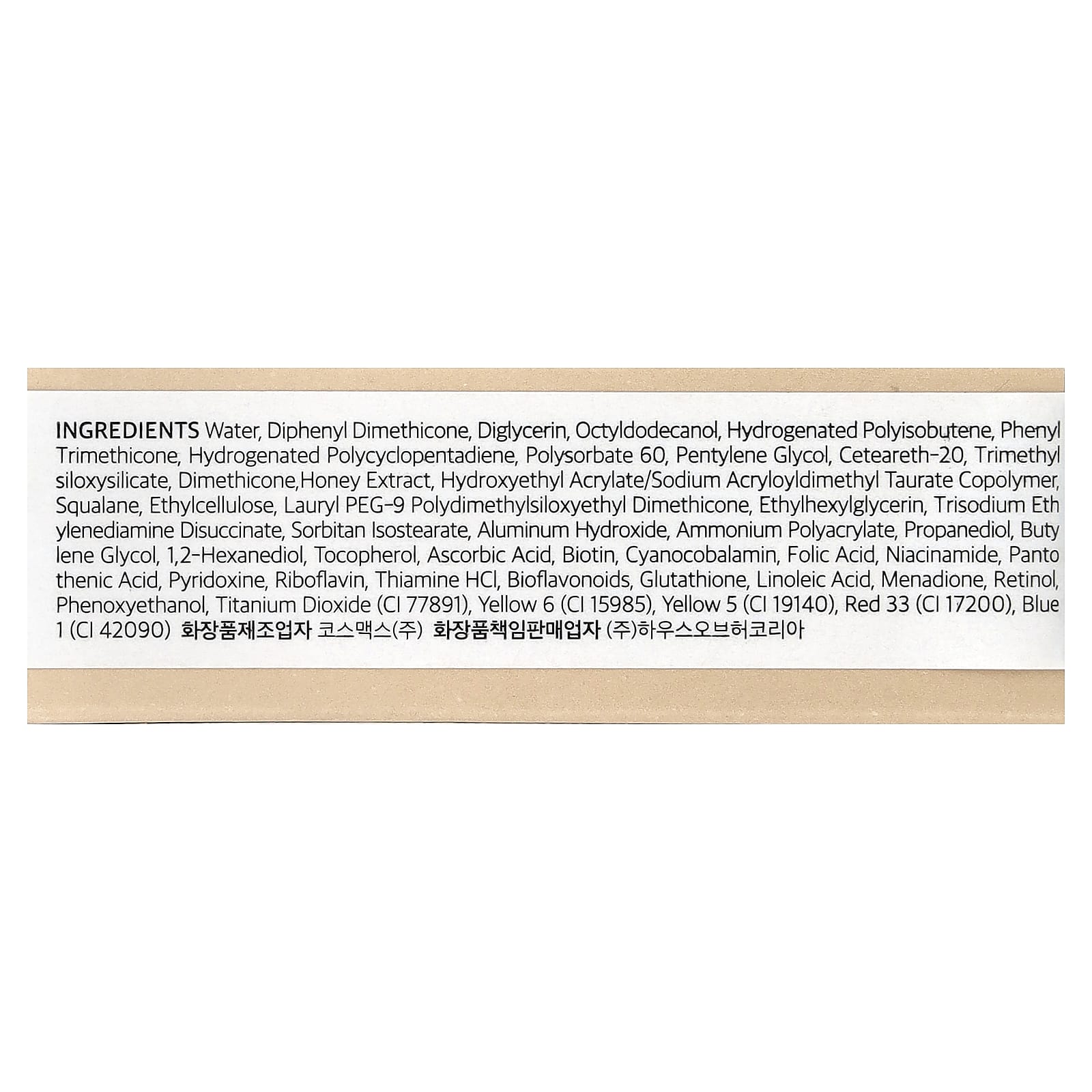 Вода, дифенил диметикон, диглицерин, октилдодеканол, гидрогенизированный полиизобутен, фенилтриметикон, гидрогенизированный полициклопентадиен, полисорбат 60, пентилен гликоль, цетеарет-20, триметилсилоксисиликат, диметикон, экстракт меда, гидроксиэтил акрилат/натрия акрилоилдиметилтаурата сополимер, сквалан, этилцеллюлоза, лаурил ПЭГ-9 полидетилсилоксиэтил диметикон, этилгексилглицерин, тринатрия этилендиамин дисукцинат, сорбитан изостеарат, гидроксид алюминия, полиакрилат аммония, пропандиол, бутиленгликоль, 1,2-гександиол, токоферол, аскорбиновая кислота, биотин, цианокобаламин, фолиевая кислота, никотинамид, пантотеновая кислота, пиридоксин, рибофлавин, тиамина гидрохлорид, биофлавоноиды, глутатион, линолевая кислота, менадион, ретинол, феноксиэтанол, диоксид титана (CI 77891), краситель желтый 6 (CI 15985), краситель жёлтый 5 (CI 19140), краситель красный 33 (CI 17200), краситель синий 1 (CI 42090).