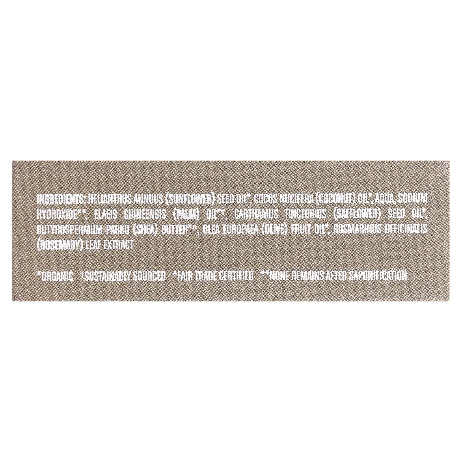 Подсолнечное масло (Helianthus annuus) *, кокосовое масло (Cocos nucifera) *, вода (Aqua), гидроксид натрия **, пальмовое масло (elaeis guineensis) * †, масло семян сафлора (Carthamus tinctorius) *, масло ши (Butyrospermum parkii)*^, оливковое масло (Olea europaea) *, экстракт листьев розмарина (Rosmarinus officinalis).