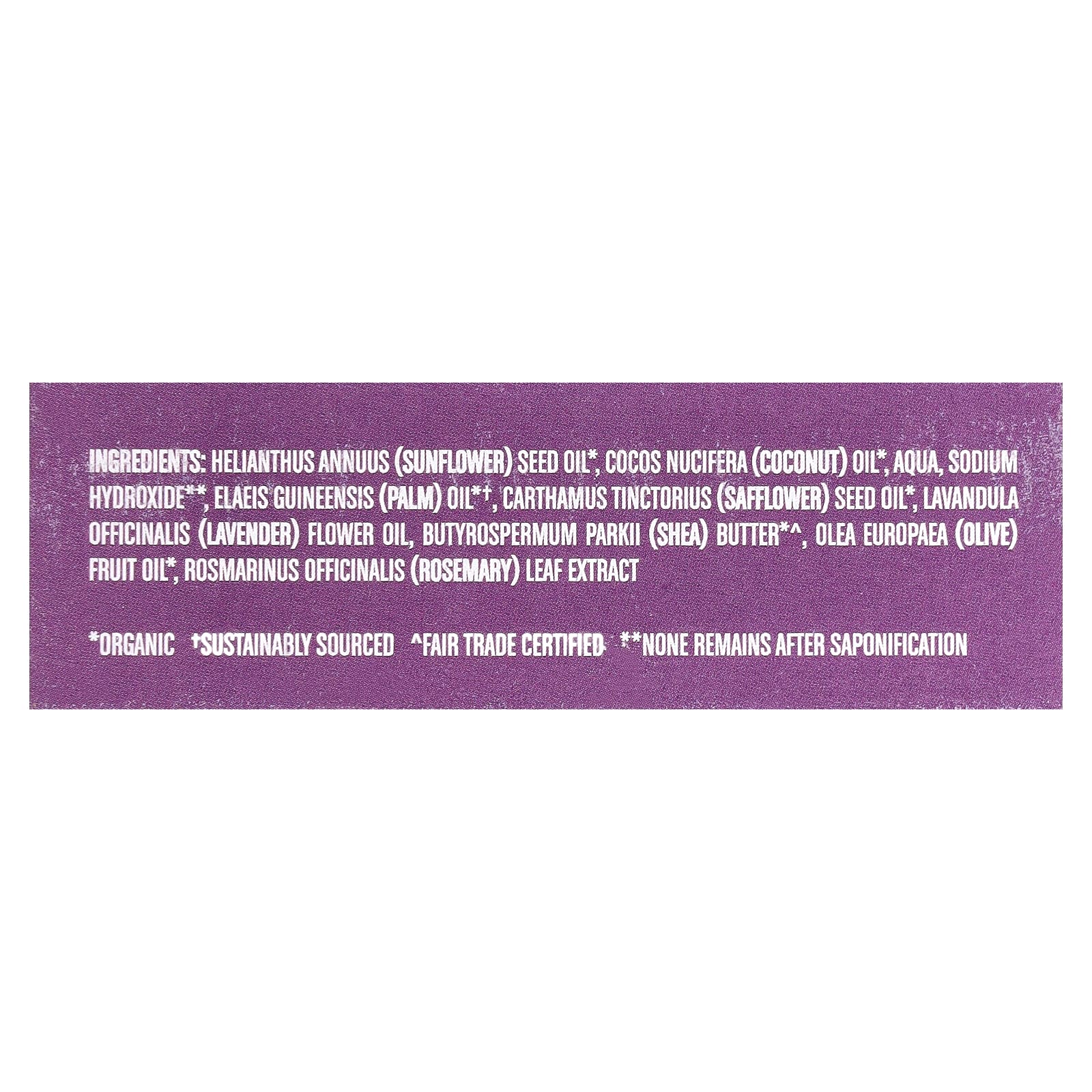 Подсолнечное масло (Helianthus annuus) *, кокосовое масло (Cocos nucifera) *, вода (Aqua), гидроксид натрия **, пальмовое масло (elaeis guineensis) * †, масло семян сафлора (Carthamus tinctorius) *, масло из цветков лаванды, масло ши (Butyrospermum parkii)*^, оливковое масло (Olea europaea) * †, экстракт листьев розмарина (Rosmarinus officinalis).