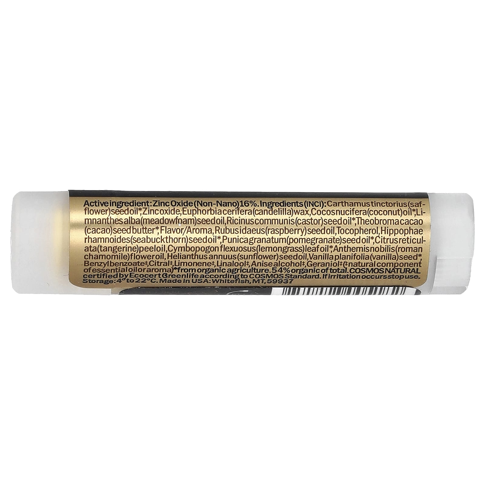 Масло семян сафлора (Carthamus tinctorius)*, канделильский воск (Euphorbia cerifera), кокосовое масло (Cocos nucifera)*, оксид цинка, оливковое масло (Olea europaea)*, касторовое масло (Ricinus communis)*, масло из зерен какао (Theobroma cacao)*, ароматизатор/вкусовая добавка, масло семян малины (Rubus idaeus)*, масло из семян облепихи (Hippophae rhamnoides)*, масло из косточек граната (Punica granatum)*, токоферол, масло цедры мандарина (Citrus reticulata), масло цветков ромашки английской (Anthemis nobilis), подсолнечное масло (Helianthus annuus), семена ванили (Vanilla planifolia)*, бензилбензоат‡, лимонен‡, линалоол‡, анисовый спирт‡, гераниол‡ (‡ натуральный компонент эфирного масла или ароматизатора).