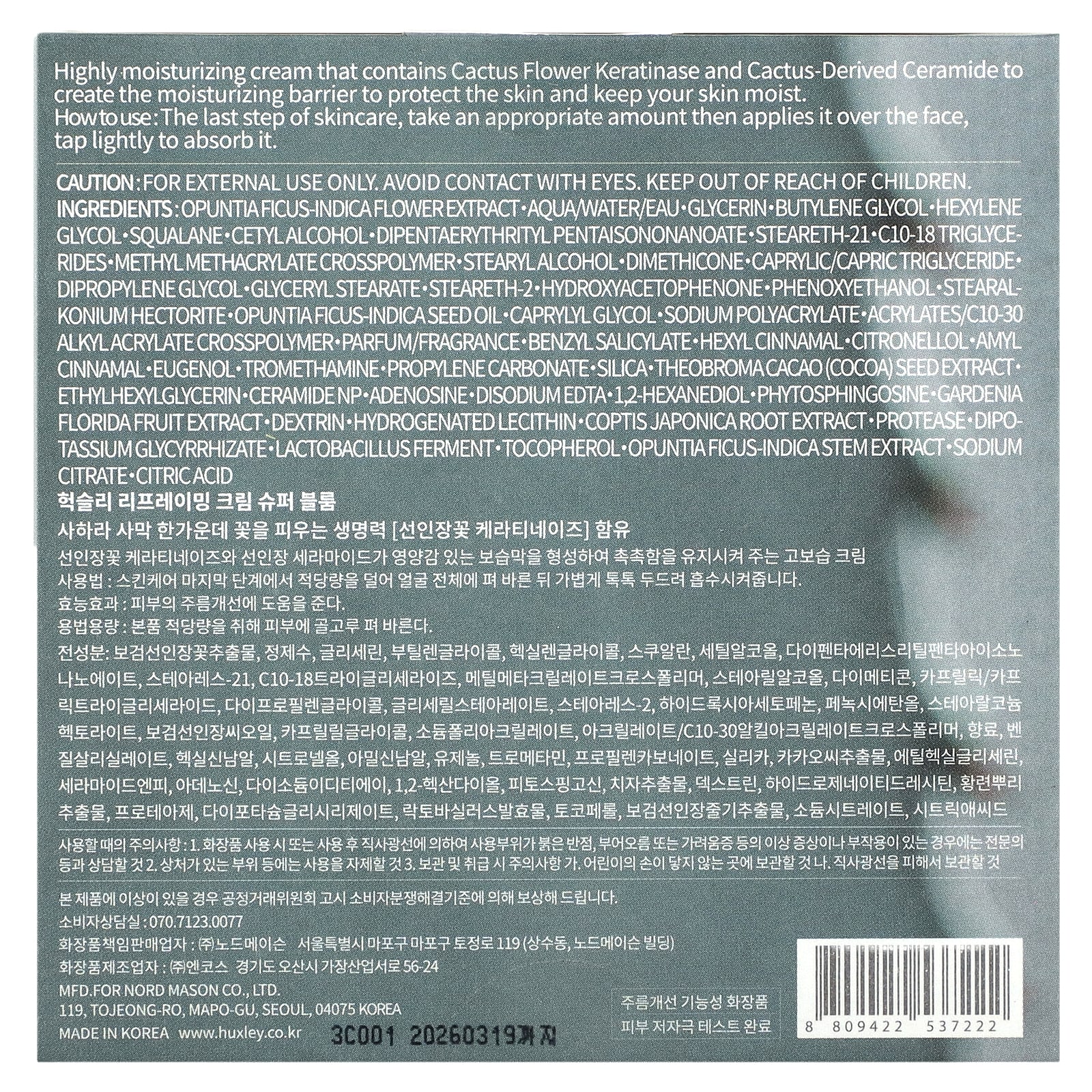 Сильно увлажняющий крем, содержащий кератиназу цветков кактуса и керамиды из кактуса, которые создают увлажняющий барьер, защищают кожу и сохраняют ее влажной.