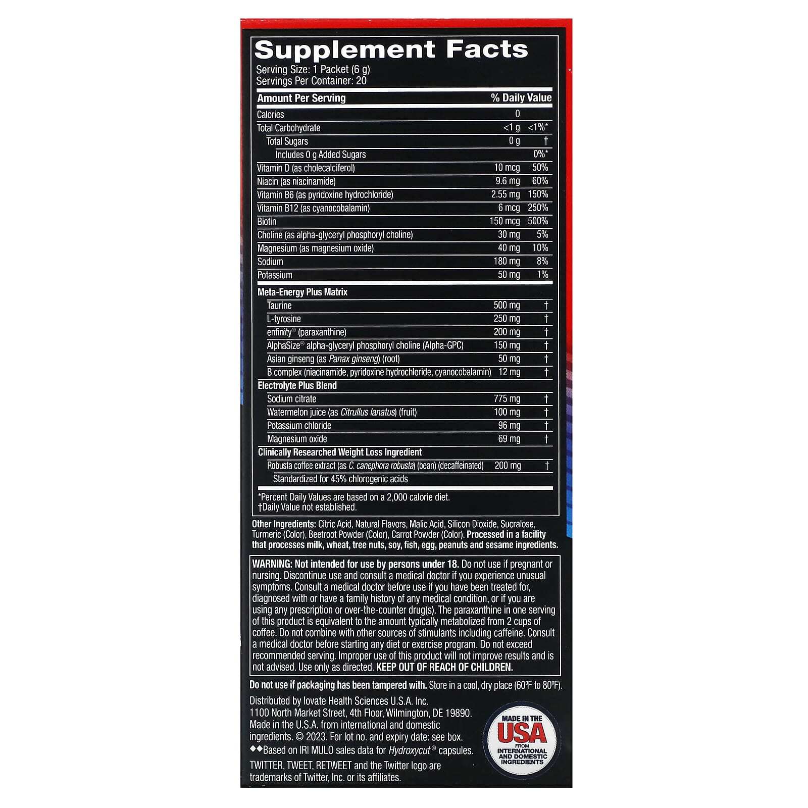 Высыпьте 1 пакетик примерно в 12 унций воды, встряхните и немедленно выпейте. Принимайте каждую порцию за 30–60 минут до двух основных приемов пищи. Не принимать за 3–4 часа до сна. Употребляйте не больше 2 порций (2 пакетиков) в течение суток. Для достижения наилучших результатов используйте продукт в течение 60 дней в сочетании с диетой с пониженным содержанием калорий и регулярной программой тренировок. Поддерживайте достаточный уровень гидратации. Перед применением прочтите всю информацию на этикетке и следуйте указаниям.