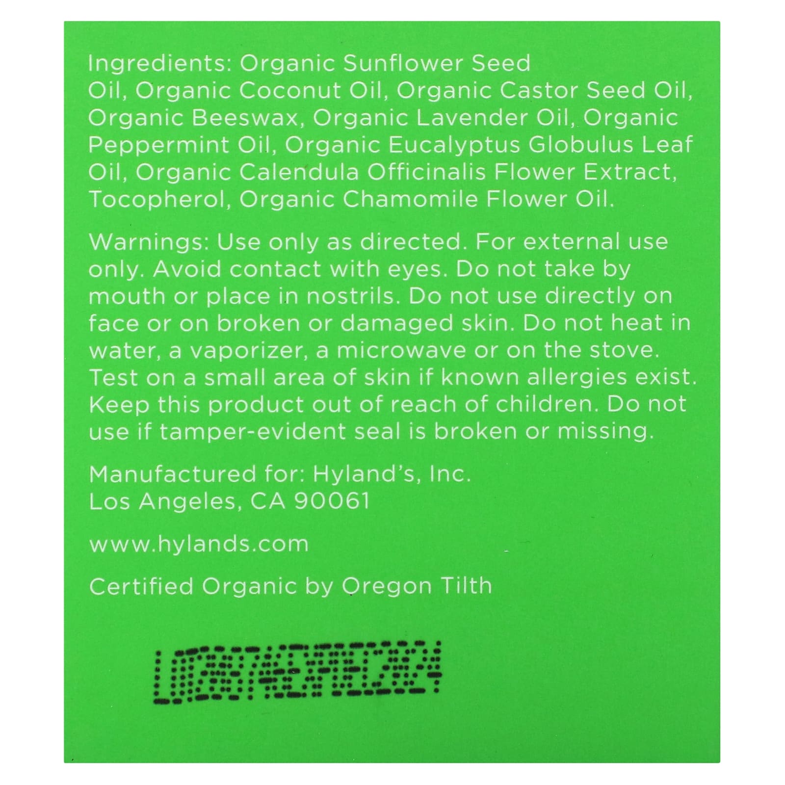 Органическое подсолнечное масло, органическое кокосовое масло, органическое касторовое масло, органический пчелиный воск, органическое лавандовое масло, органическое масло перечной мяты, масло из листьев органического эвкалипта шаровидного, органический экстракт цветков календулы (Calendula officinalis), токоферол, органическое масло цветков ромашки.