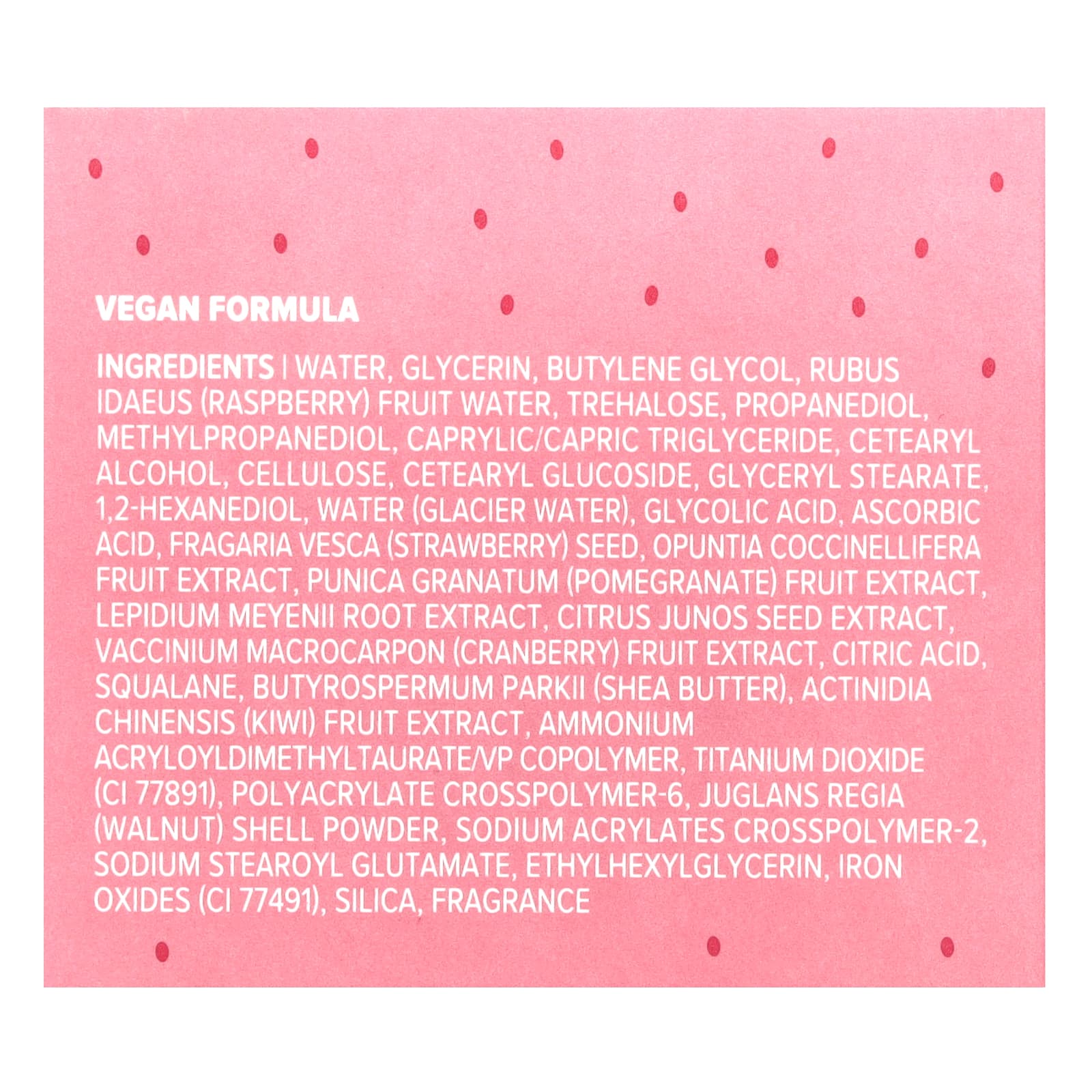Вода, глицерин, бутиленгликоль, соковая вода малины (Rubus idaeus), трегалоза, пропандиол, метилпропандиол, каприловый/каприновый триглицерид, цетеариловый спирт, целлюлоза, цетеариловый глюкозид, глицерил стеарат 1,2-гександиол, ледниковая вода, гликолевая кислота, аскорбиновая кислота, семена клубники (Fragaria vesca), экстракт плодов опунции кошениленосной (Opuntia coccinellifera), экстракт плодов граната (Punica granatum), экстракт корня маки (Lepidium meyenii), экстракт семян юдзу (Citrus junos), экстракт ягод клюквы (Vaccinium macrocarpon), лимонная кислота, сквалан, масло ши (Butyrospermum parkii), экстракт плодов киви (Actinidia chinensis), аммоний акрилоилдиметилтаурат/ВП сополимер, диоксид титана (CI 77891), полиакрилата кроссполимер-6, порошок из скорлупы грецкого ореха (Juglans regia), кроссполимер-2 акрилатов натрия, натрия стеароил глутамат, этилгексилглицерин, оксиды железа (CI 77491), диоксид кремния, отдушка.
