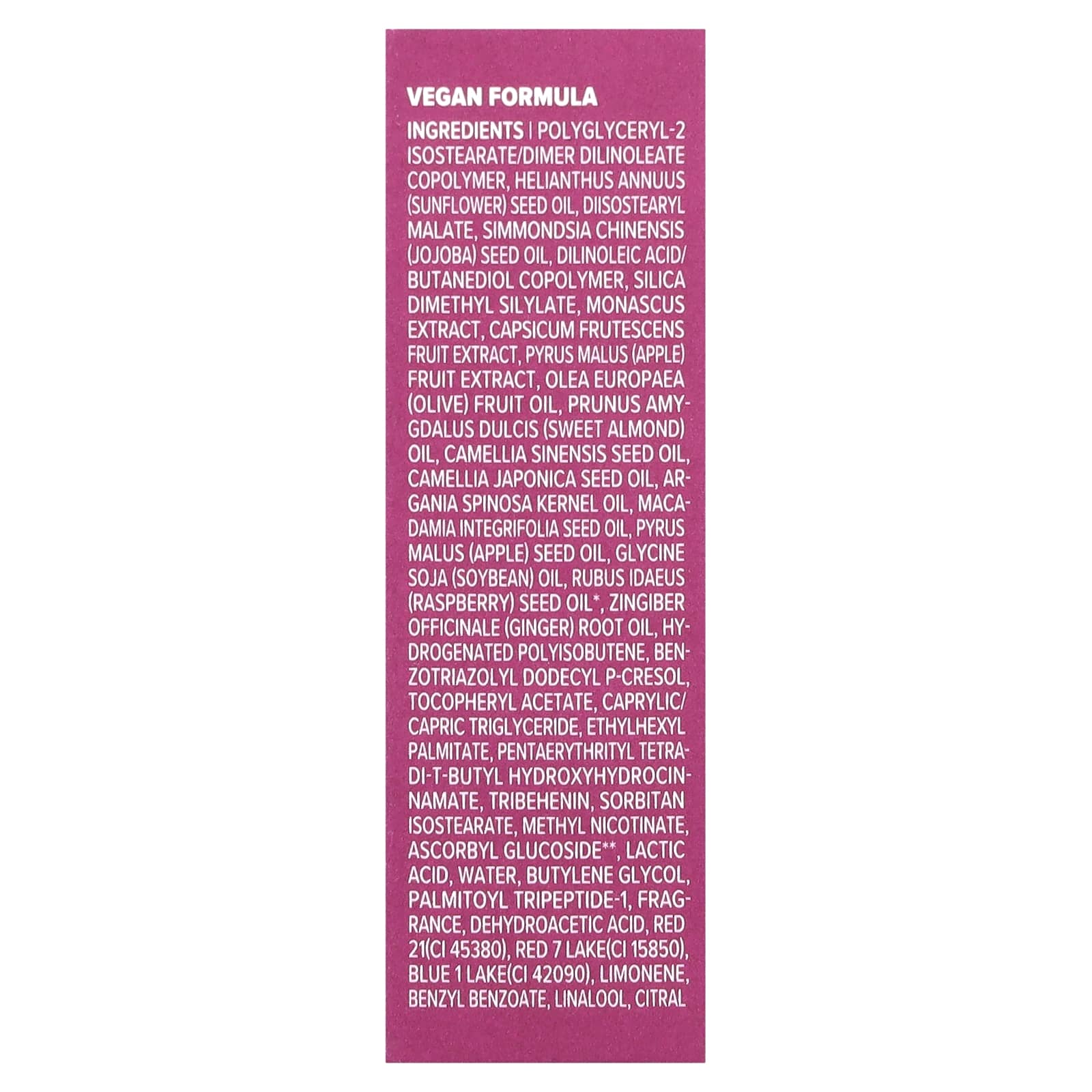 Полиглицерил-2 изостеарат/димер дилинолеат сополимер, подсолнечное масло (Helianthus annuus), диизостеарил малат, масло из семян жожоба (Simmondsia chinensis), дилинолевая кислота/бутандиол сополимер, диметил силилат диоксида кремния, экстракт гриба Monascus, экстракт перца (Сapsicum frutescens), экстракт яблока (Pyrus malus), оливковое масло (Olea europaea), масло сладкого миндаля (Prunus amygdalus dulcis), масло из семян зеленого чая (Camellia sinensis), масло из семян камелии японской (Camellia japonica), аргановое масло (Argania spinosa), масло макадамии (Macadamia integrifolia), масло из семян яблони (Pyrus malus), соевое масло (Glycine soja), масло семян малины (Rubus idaeus)*, масло корня имбиря (Zingiber officinale), гидрогенизированный полиизобутен, бензотриазолил додецил п-крезол, токоферилацетат, каприловый/каприновый триглицерид, этилгексил пальмитат, пентаэритритил тетради-трет-бутил гидроксигидроциннамат, трибехенин, сорбитан изостеарат, метил никотинат, аскорбил глюкозид, молочная кислота, вода, бутиленгликоль, пальмитоил трипептид-1, отдушка, дегидроуксусная кислота, краситель красный 21 (CI 45380), краситель красный 7 лак (CI 15850), краситель синий 1 (CI 42090), лимонен, бензилбензоат, линалоол, цитраль.